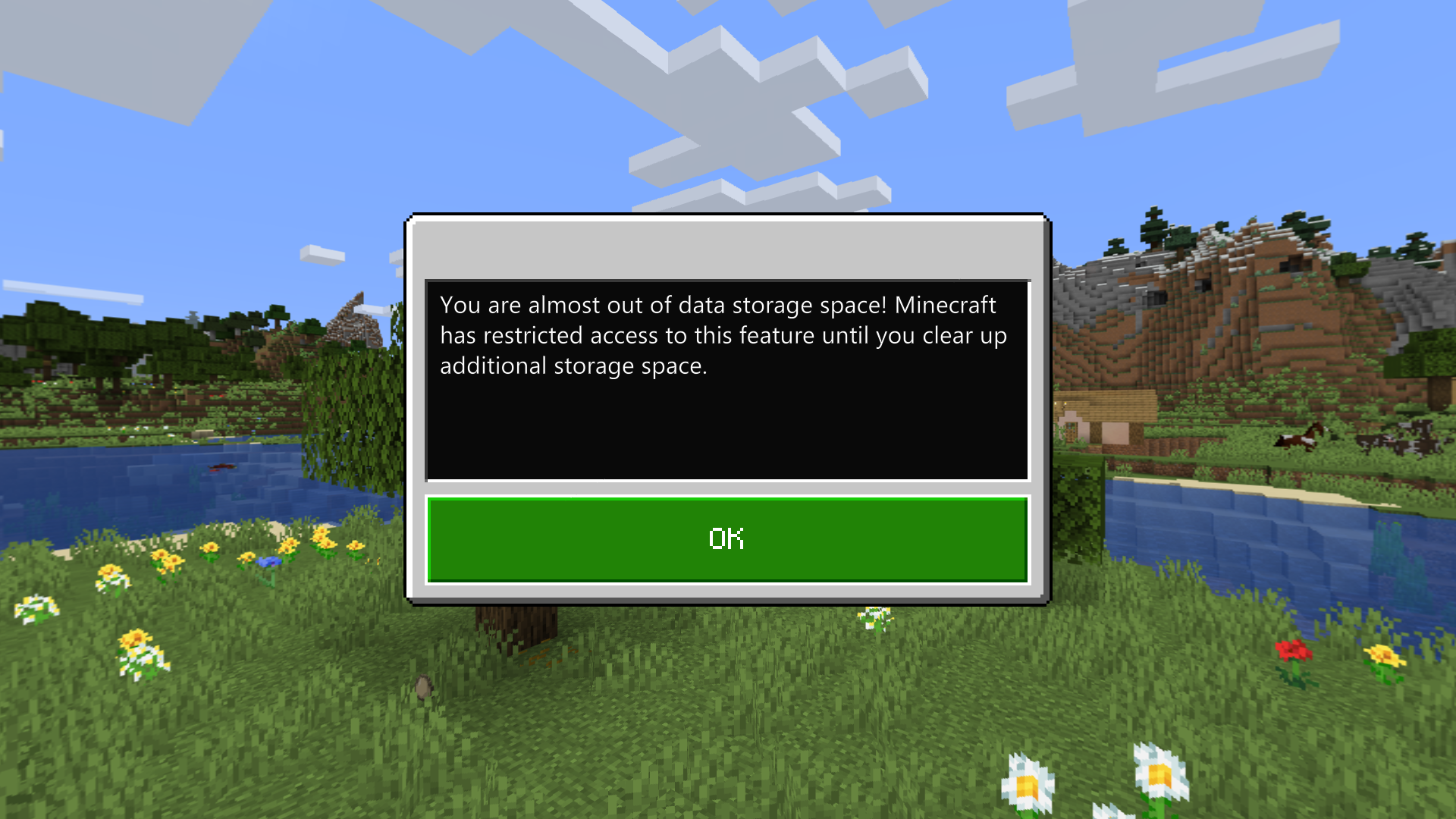 Got the prompt when I went to start up 3.3 GB world today. I uninstalled games on both my external and internal drives and have confirmed they both have plenty of storage. Hard resetting Xbox doesn't fix the issue.