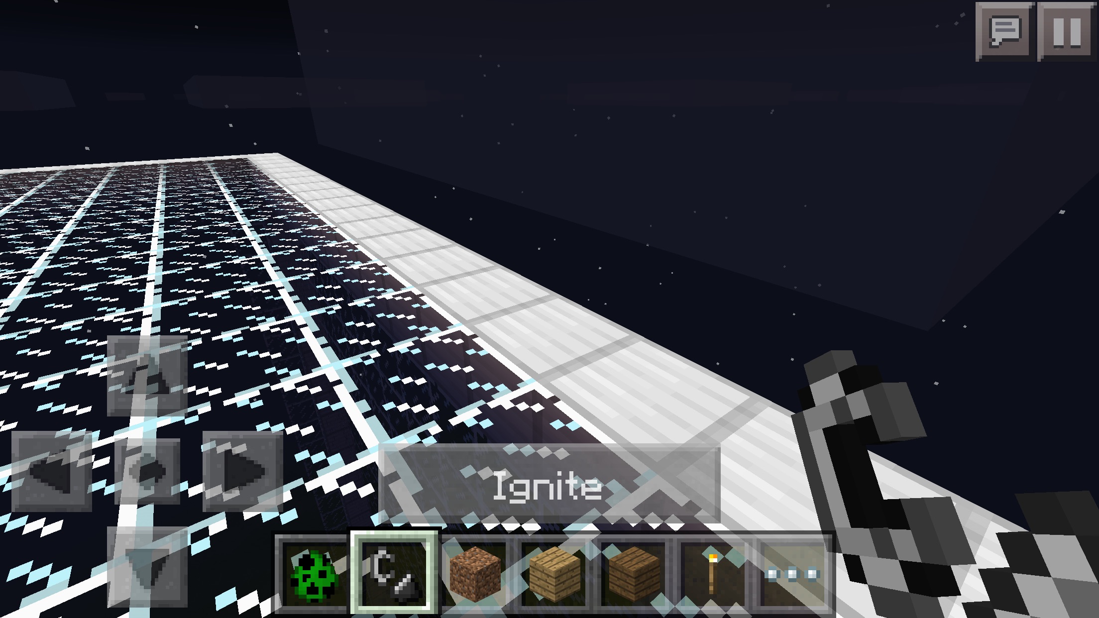 Entities are invisible when at or above the maximum build height (x, 127, z). Tested in creative mode with arrows, mobs, and thrown eggs. Shown is a pair of chickens in love mode being led up one block from y=126 with seeds, and the ignite button for a creeper located at y=127.