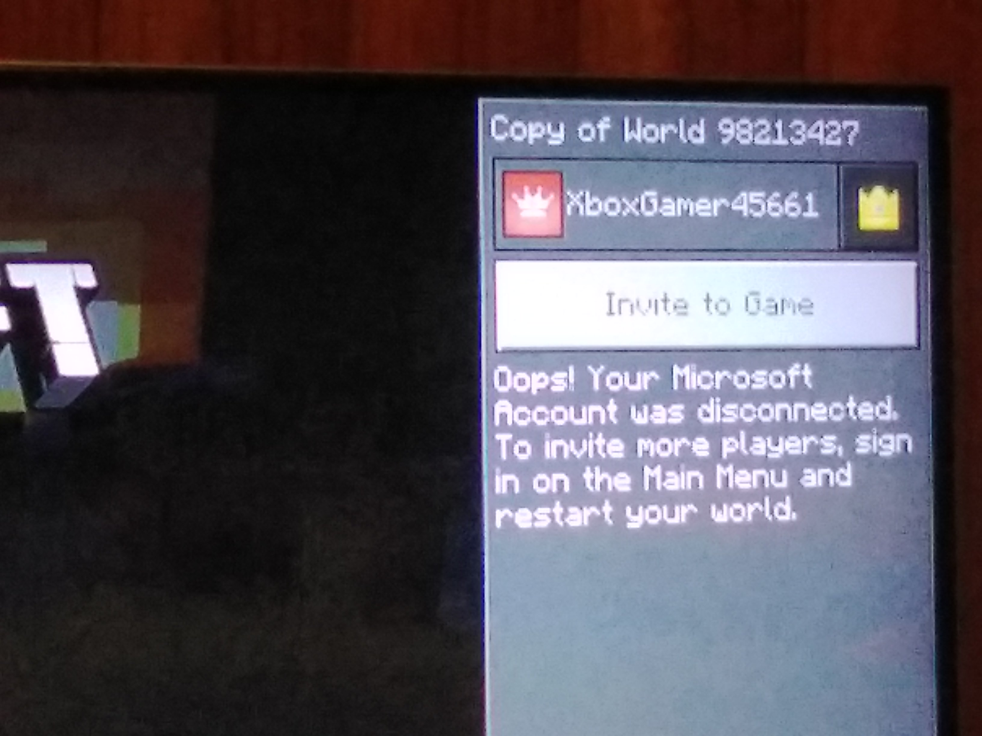 It says Oops! Your Microsoft Account was disconnected. To invite more players, sign in on the Main Menu and restart your world. Im already signed in and the only way to fik this is to restart the game. Very frustrating. Please fix this.