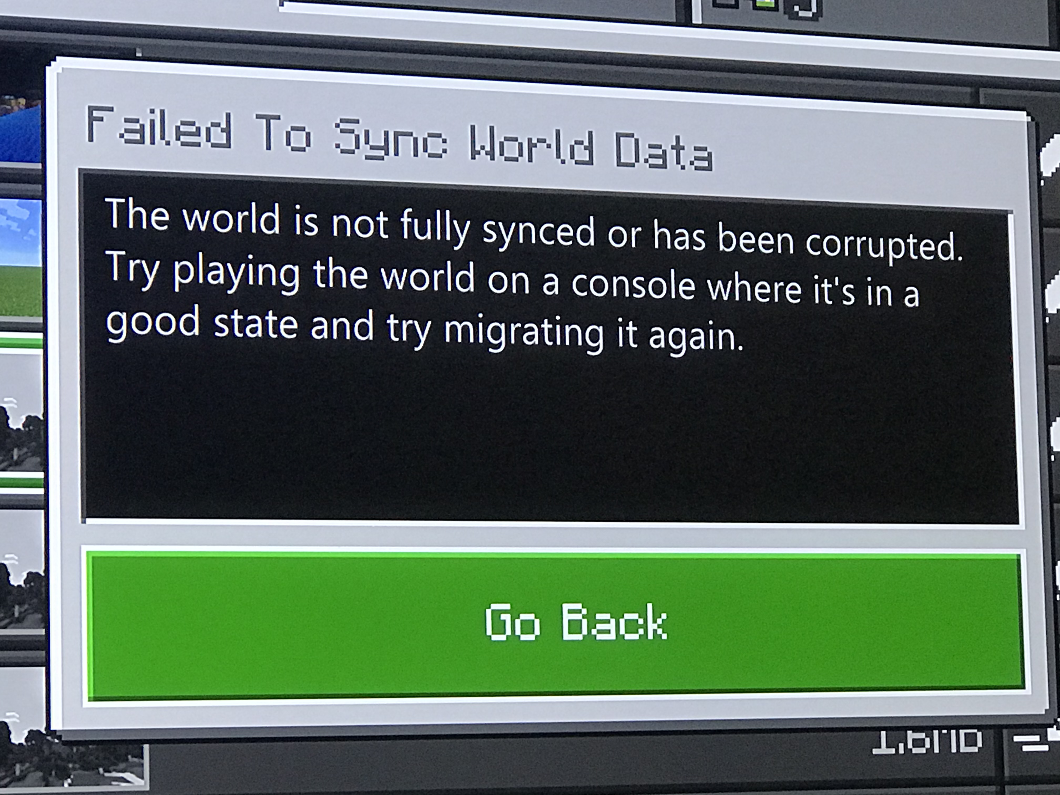 ”The world is not fully synced or has been corrupted. Try playing the world on a console where it's in a good state and try migrating it again.”