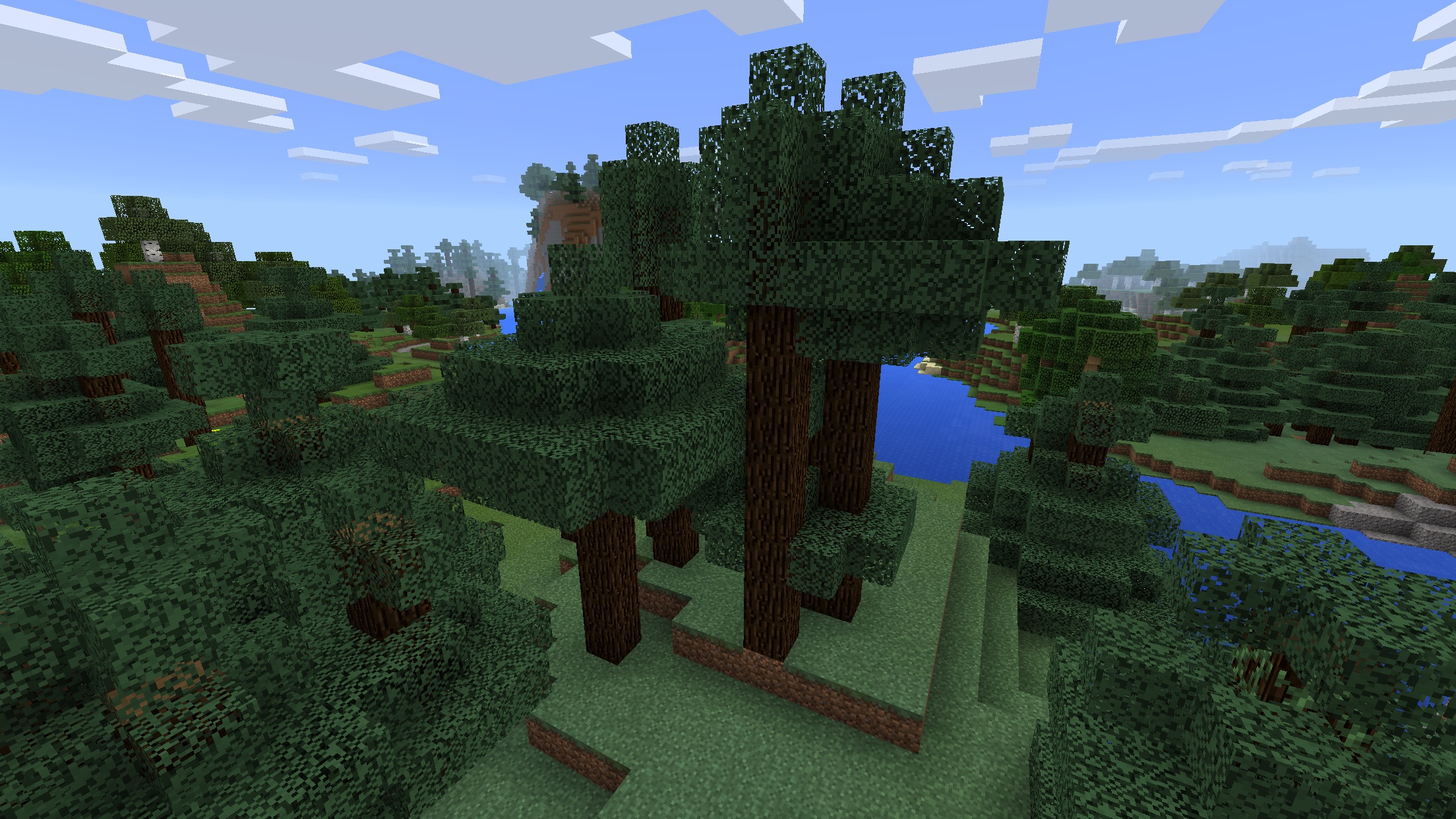 Certain tree types are able to spawn without checking for other structures, meaning that they can be found with trunks touching or overlapping (shown). Known trees affected are swamp oaks, and the ungrowable spruce variants.