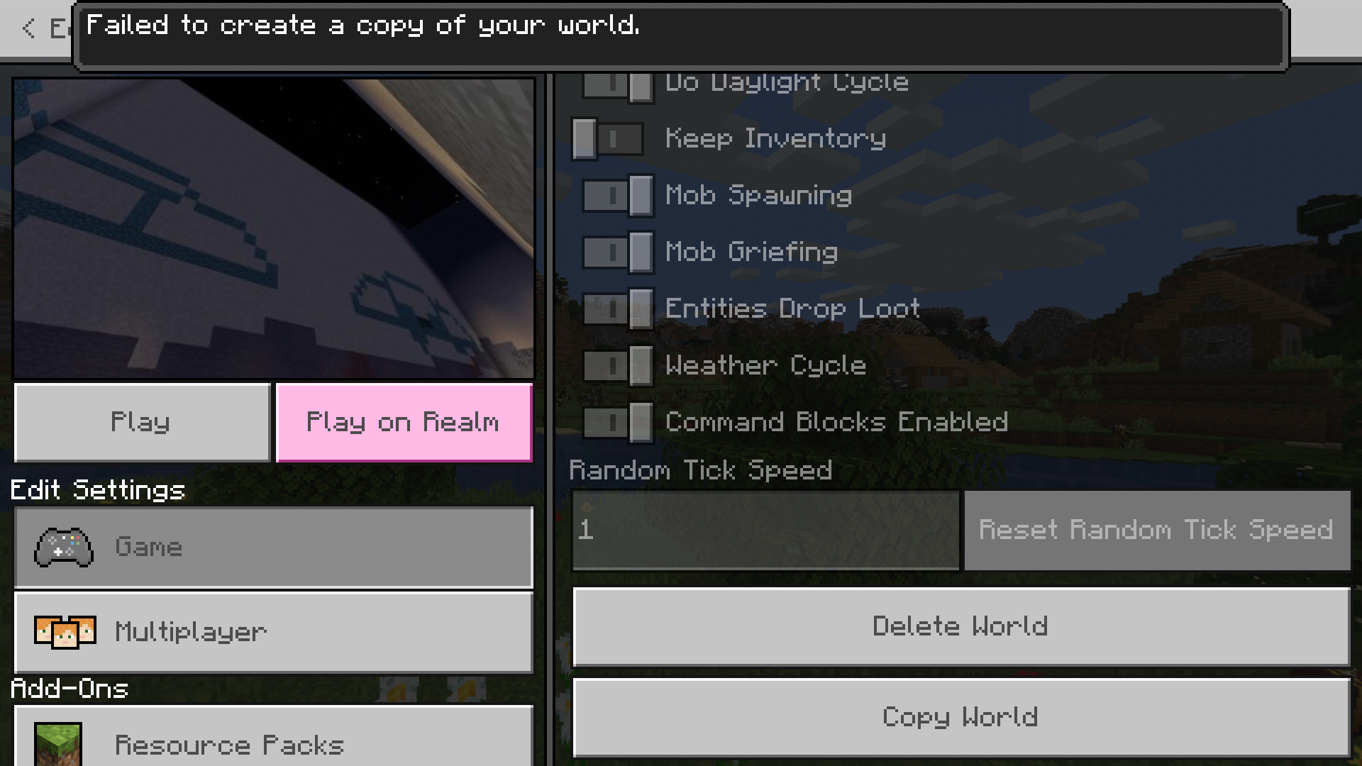 Failed to copy saved world. Quit in game, and restarting app wont change.