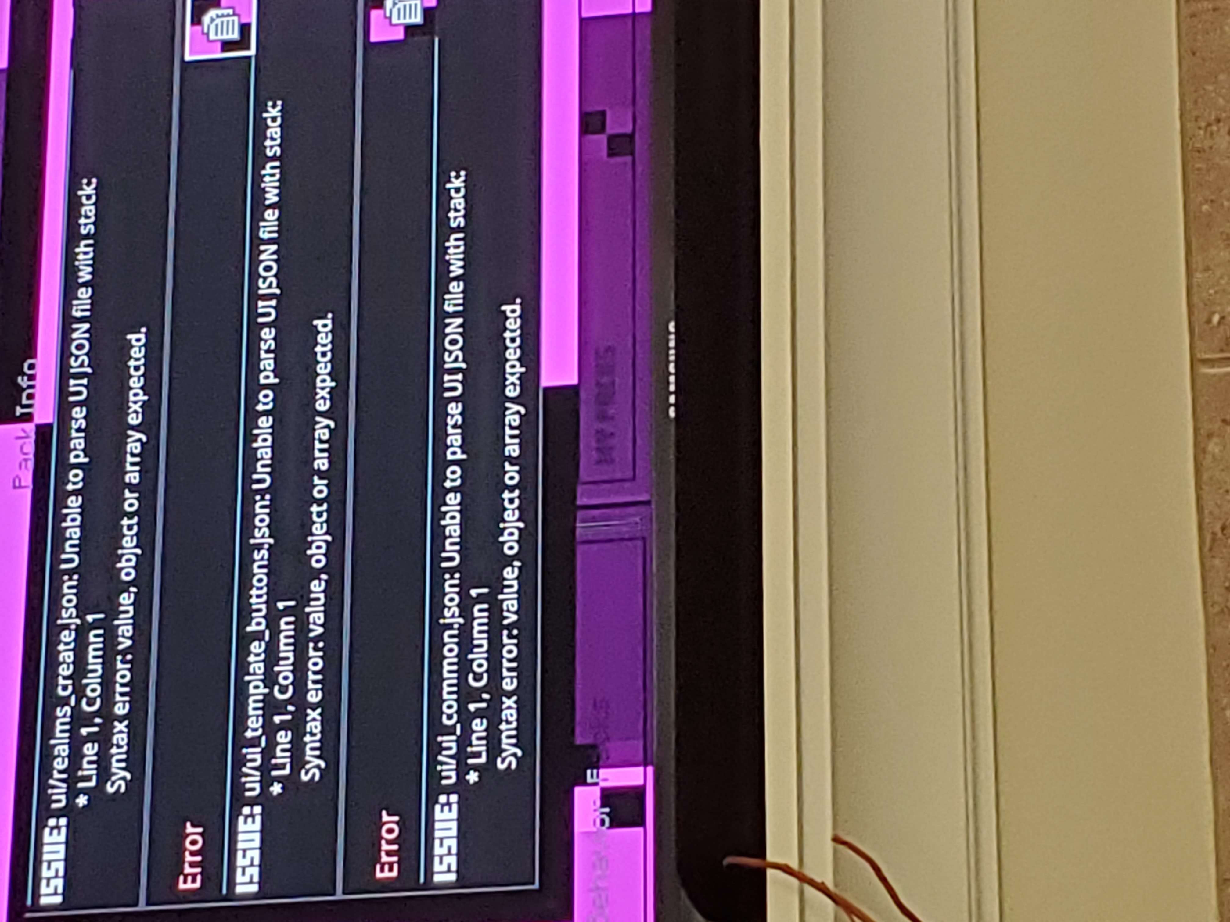 Images attached. Ever since the nether update, the center target and hot bar have been pink and black checkerboards in worlds with the natural texture pack. Both existing and new worlds. Other texture packs don't do this. The settings/options menu is also unreadable pink and black. Texture pack shows 7 errors in the game settings.Β