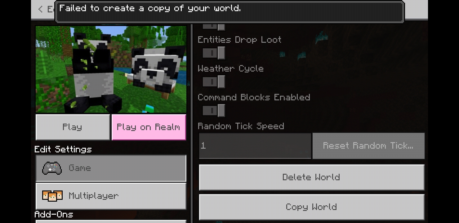 im searching the jungle bio to find bamboos and after i save and exit to try copy my world the system always says that my world cannot copy because its always fail even i try to restart the phone/clear cache the application, nothing can't do.