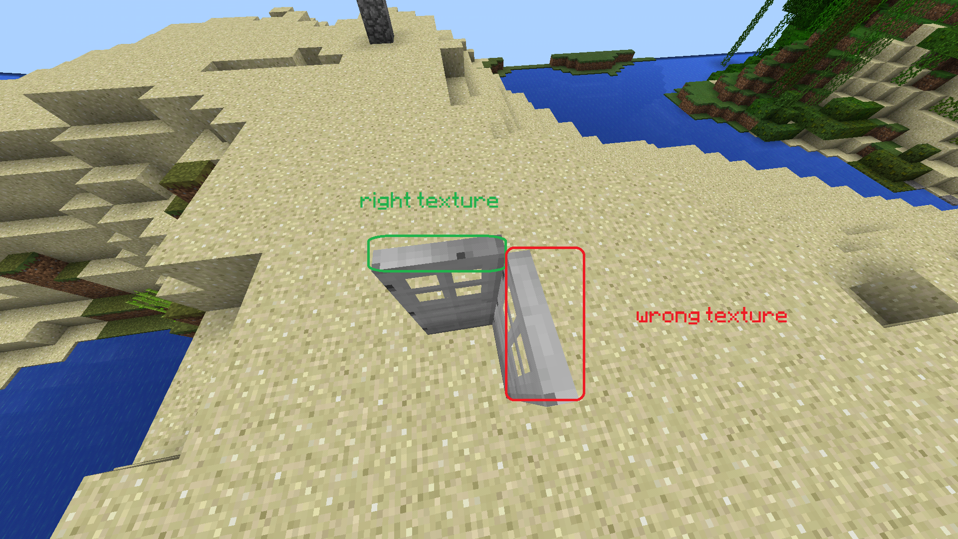 Confirmed bug 0.12.1 build 10. The door texture in MCPE is missing the 3 hinges on the side of the door and shows door knob instead. Photo attached shows the correct door side texture.