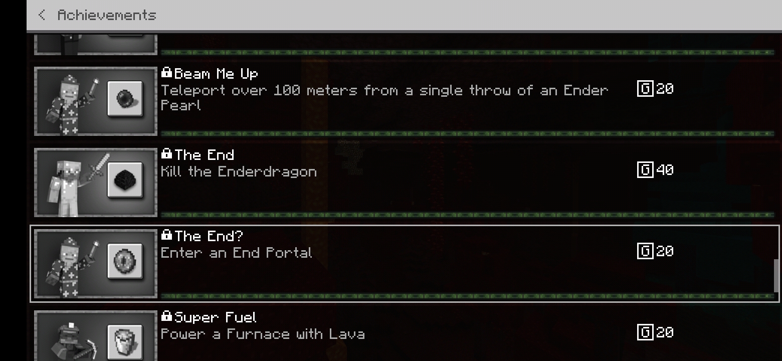 Recently I stopped getting achievements. I haven't unlock them all, but for some reason it doesn't let me get anymore achievements. This happened around 5 days ago where I was looking through my achievements to see what else do I need to do and I say the achievement "cook a porkchop" I tried cooking one and eating it but it didn't work and I just check right now and it only say 50%. Its been 50% for the past month or so. While realised it wasn't working, I tried to kill the ender dragon in survival, ( I've never went into creative in that world) and while looking for the achievement I notice that I didn't get the achievement for entering and killing her (dragon.) For the first ever time out of my 8 years of playing minecraft ( I know it sounds fake but its true) I was expecting to get "the end" achievements.. and I didn't. So if yall would be so nice to explain to me what i should do I take the advice!