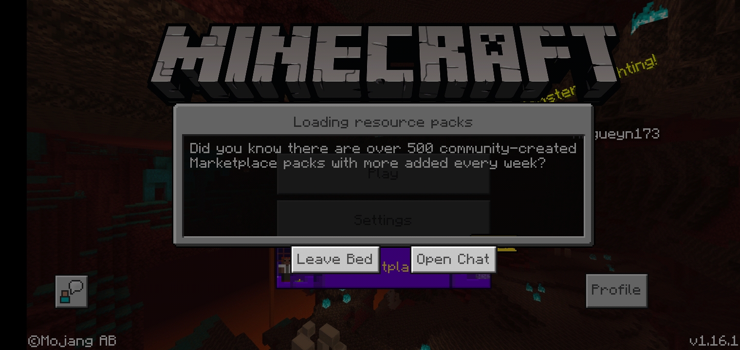 So i was playing online with xbox with my friends.(im the host) And when i went to sleep, the game crashed i got out to homescreen(my friends got disconnected too). And when i return to my world it appears with a 'loading resource packs' bar and a "leave bed" and "open chat" below the 'loading resource packs bar'(as the picture) and after that a second i got kicked out from minecraft. Ive tried to click leave bed as soon as possible but its still not working. |