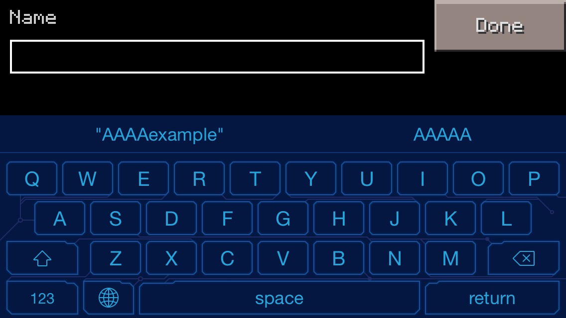 Bellow are photos of attempting to type in a username and the custom keyboard that had suggested words (By typing "example" or any text, it appears that four phantom A's are in the text box. However, no amount of deleting removes them.).