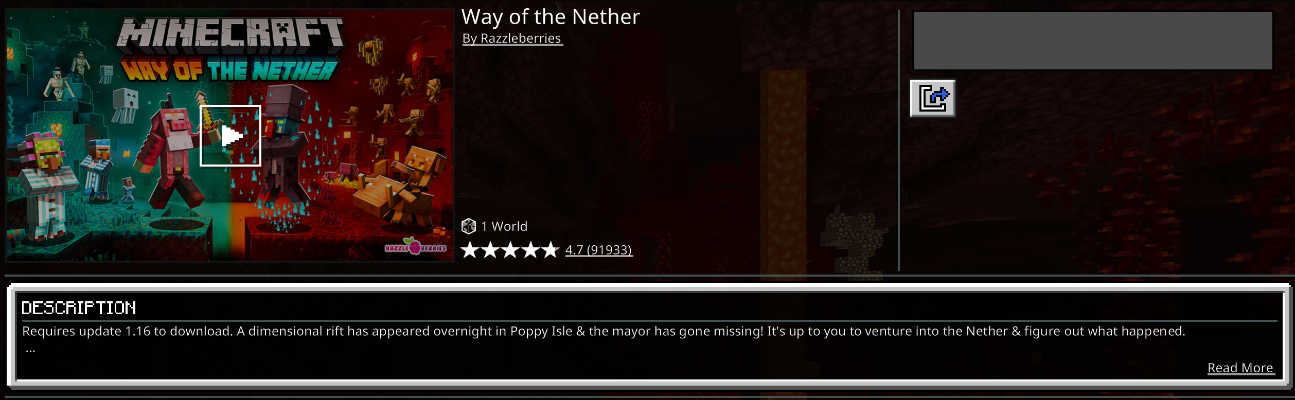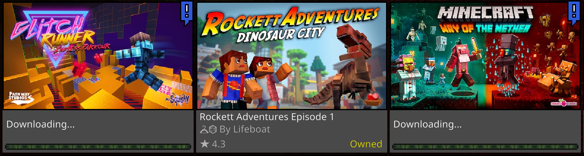 Some of the free marketplace items that I get, begin to "download," but isn't actually downloading. Rather, it's stuck downloading at what it looks like to be 0%, none of the progress bar is filled, and when I click that item, the install/download button is grayed out and blank. So far, only 3 of the items I got are stuck this way, which are, Way of the Nether, Safari World, and Glitch Runner: Endless Parkour. Closing out of the game and coming back in doesn't fix it, too.