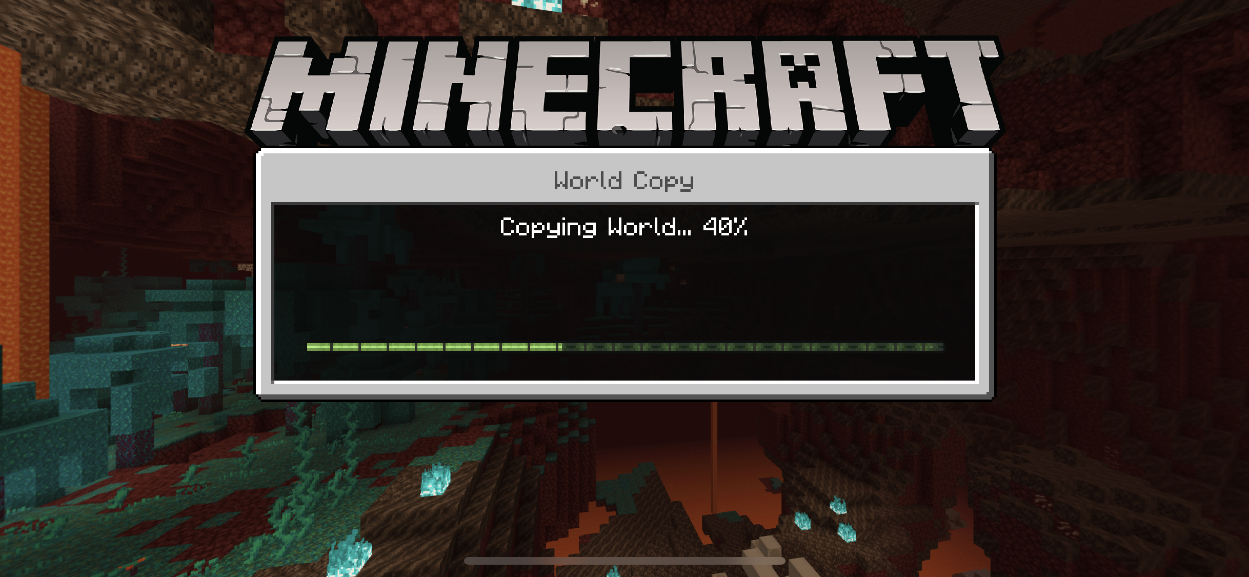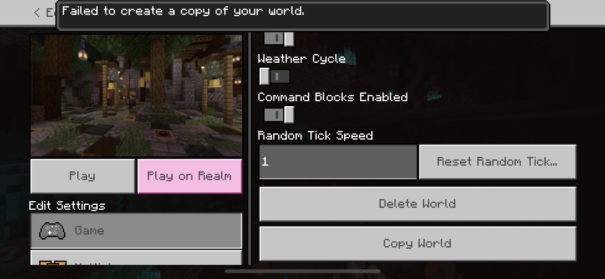 When attempting to copy the world, the screen will change to the loading bar and quickly load to exactly 40% and stop. It then sits at this point for about 3-4 second and then returns to the settings menus and displays the “Failed to copy world” error message.