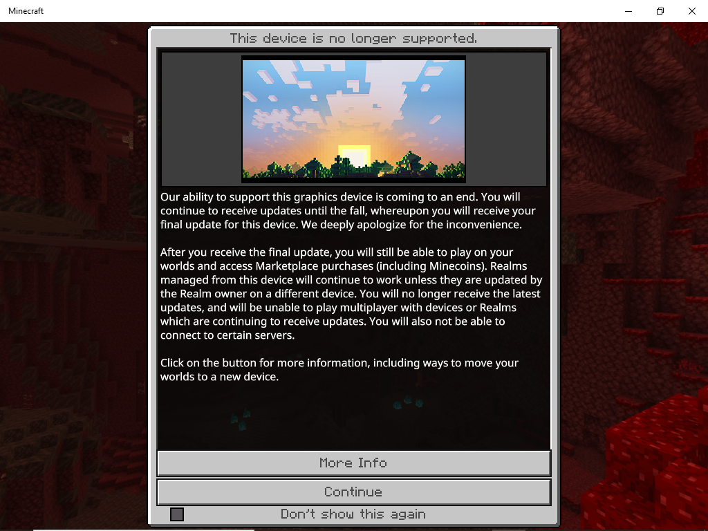 {{When I went to play Minecraft as usual *_( On another device as my main device crashes every time and I already did a bug report about that)_* I got a message saying that my device is no longer supported, which means I can't play multiplayer, server and more. But the thing is, I am not playing on *Gear VR*, and I am playing on *windows 10 PC* not *Windows 10 Mobile*, I am on *windows* not on *Android devices with less than 768MB of RAM* or *iOS devices running iOS* *10* or below. Long story short, I am on *Windows 10 PC.*I am also on *DirectX12*. So why did I get this message ?}}