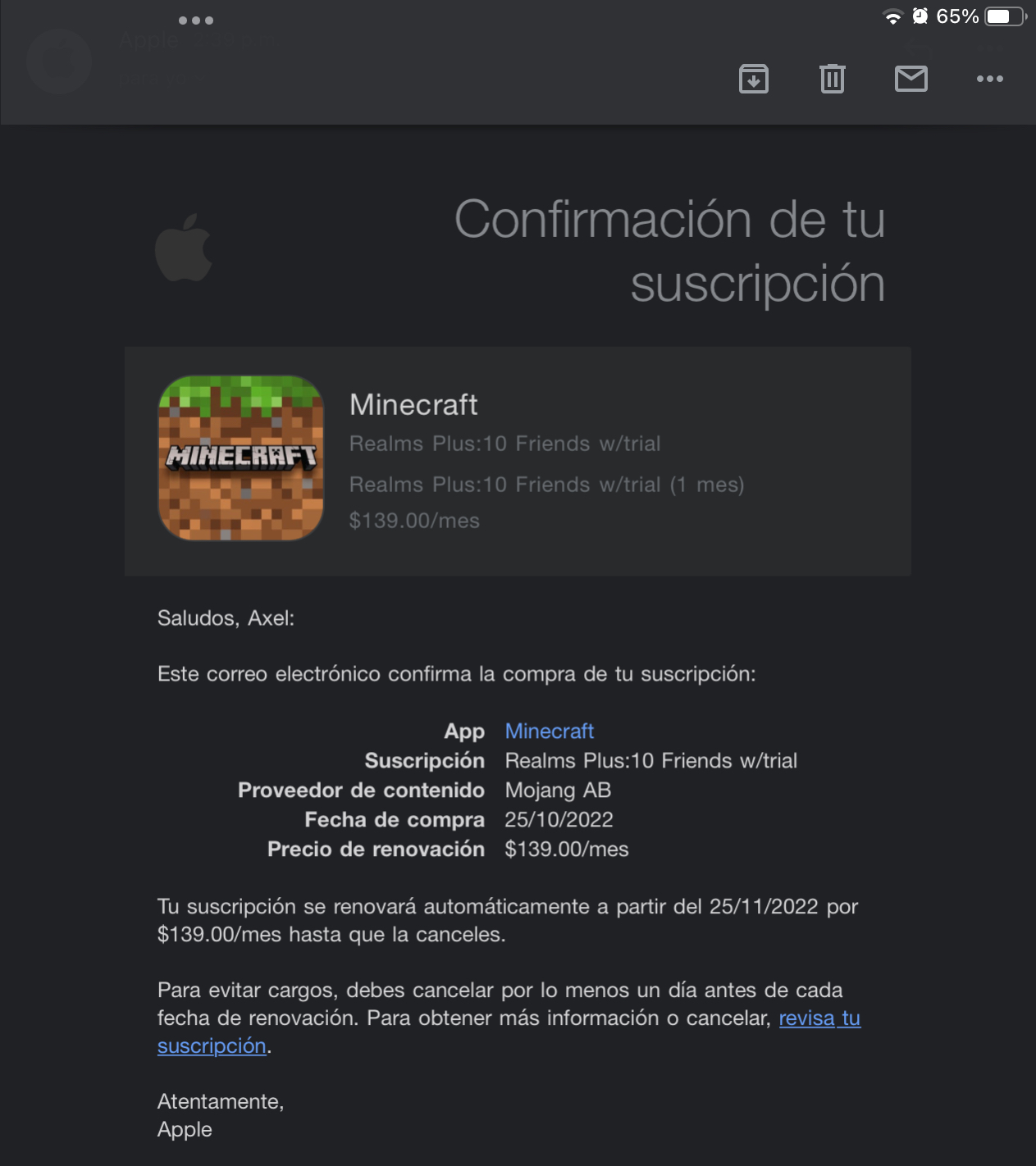 I already made my minecraft realms payment for a month with a charge of 139 per month at approximately 2:40, but for some reason when I try to create my realm I get this on the screen (attached evidence), I would like you to help me solve this problem since the money was already spent