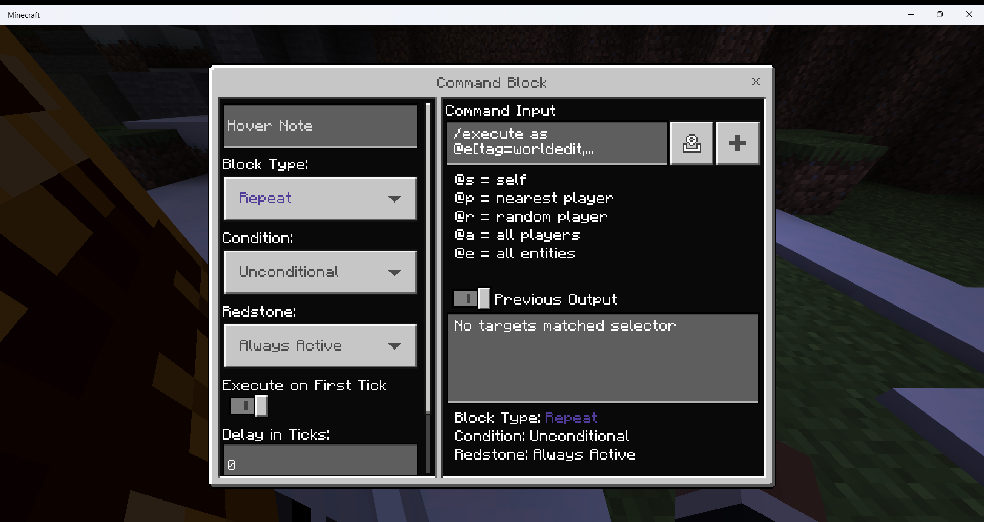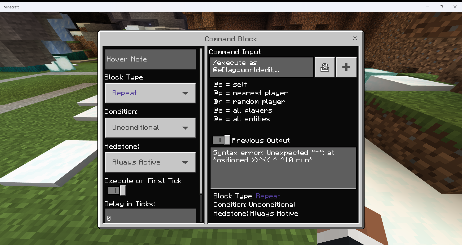 For some reason our world edit commands using /execute no longer work on realms, but when we are on a regular world (same world as the realm) the command works. This is very inconvenient as me and a few buddies are building a map with major terrain. The error that keeps appearing in the command block is a syntax error that also says Unexpected. I have no clue what is going on as it worked perfectly fine BEFORE 1.19.80 and now it only works on the world.