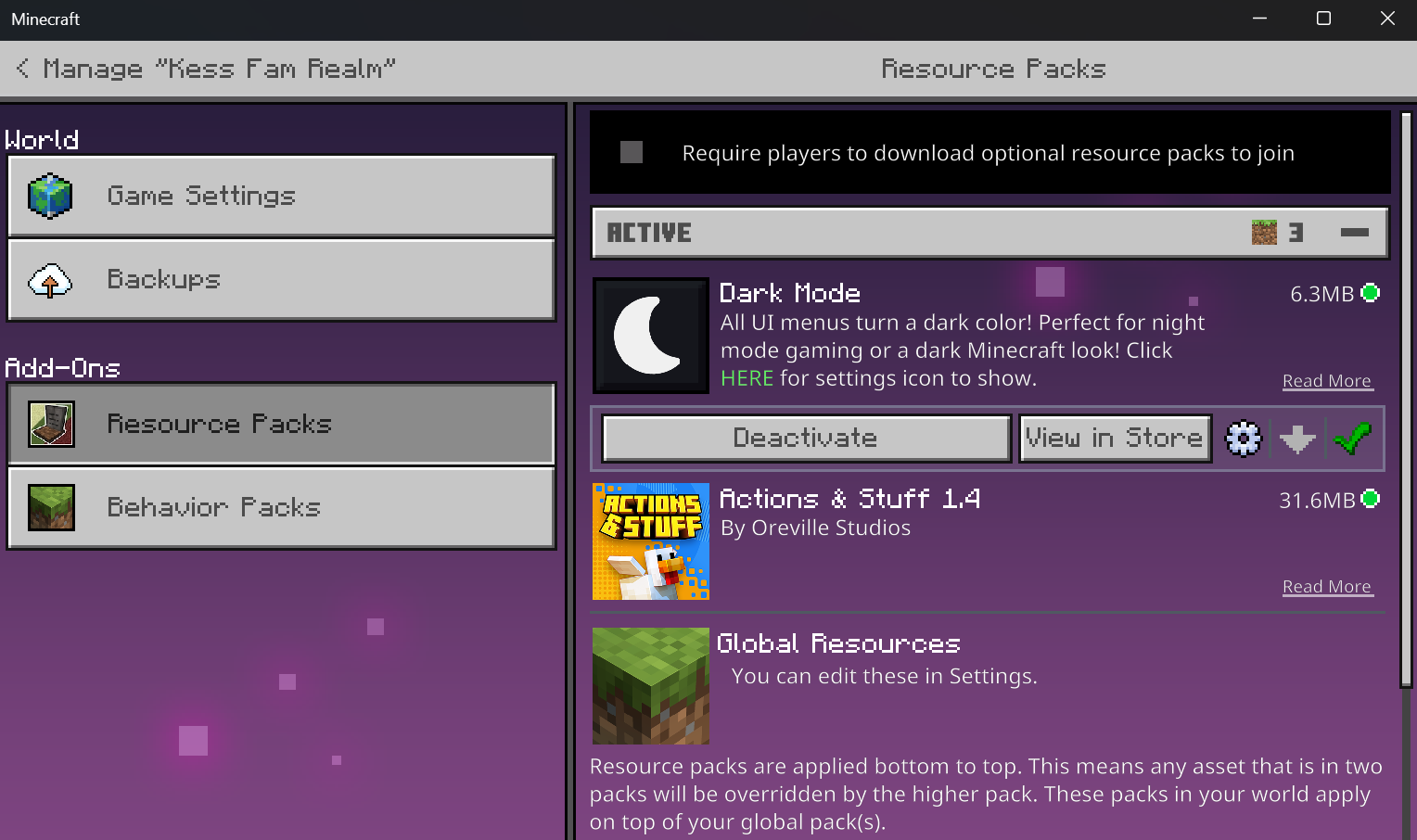 I expected to be allowed to order my resource packs and add ons without it resetting on me just like a normal world would. Why can’t you add the arrow keys like you did with a normal world but not for a realms world? This has been a issue for 2 years. All we want is to properly order our packs, its really simple to code actually.