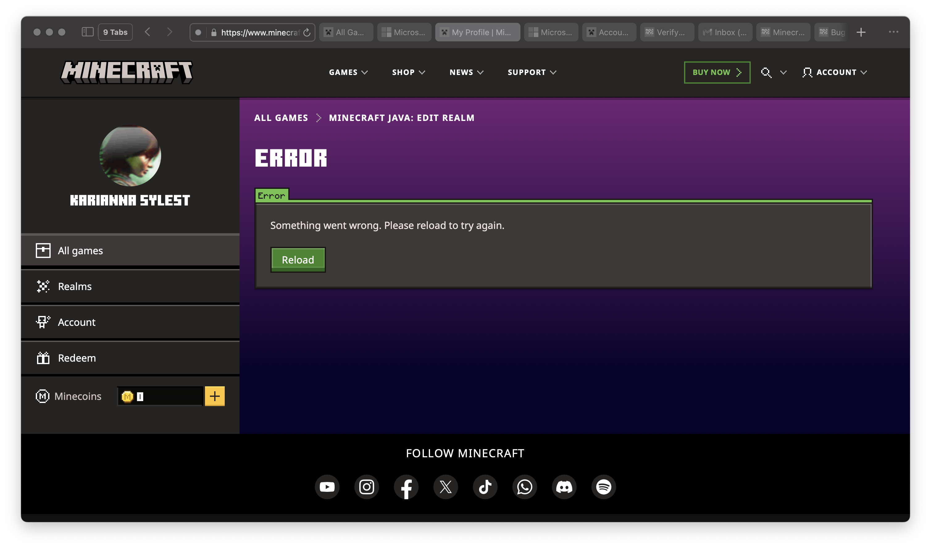 I renewed an old Java edition Minecradt Realm but it has not restored correctly. In the Minecraft Java client it still lists the Realm subscription as expired and in the web portal when I click on the Realm settings I get “Something Went wrong. Please reload to try again”. When I hit reload it simply takes me to the home page of that portal.