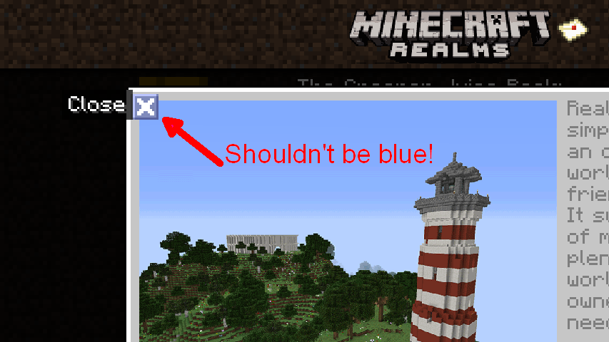The "What is realms" screen's close button will be highlighted in blue even though buttons were changed to have white outlines instead of being highlighted in blue.