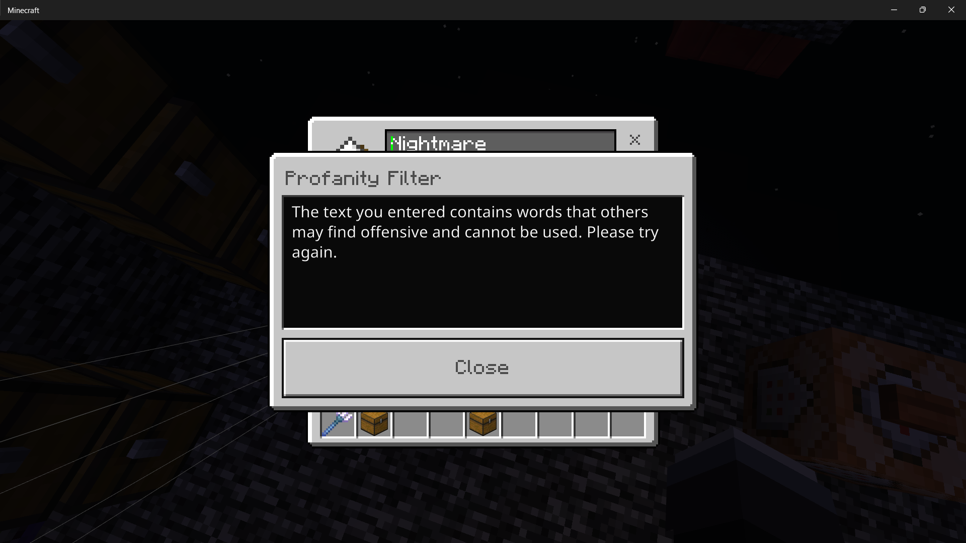 other note of my 2 cents for the devs: give us an option to disable the profanity filter for our realms and worlds, and for realms, have it hidden behind another command, for example: "/gamerule showhiddencommands true" needs to be done to enable things like disabling the profanity filter, which could be "/gamerule dochatfiltering false", this way it will be a bit difficult to do, especially if you remove the "/gamerule showhiddencommands" from the command auto complete list (like where if you type "/gamerule show" it'll say "/gamerule showcoordinates" as a possible command), because firstly: most kids who are too young to see swears won't know how to use commands to begin with, secondly, they almost always use the auto-complete list for 99% of commands, at least the ones i've met, and then it's also gatekept behind another command, so not only is it hidden behind another command, but that command is also hidden, so it'll be really hard to do so, and the only place this will be logged is on a patch notes sub page that is age-gated to an appropriate age, something, just allow us to disable the profanity filter, also, allow a secondary option to filter chat for every member, so signs and item names won't be censored, but chat will be for that user, as a client side option. just some way to disable it, it doesn't have to be this complex, but it's just a thought.