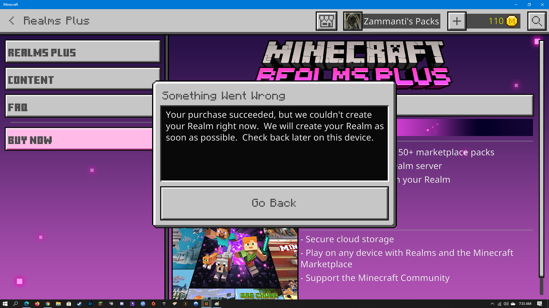 "Something Went Wrong" -> Your purchase succeeded, but we couldn't create your realm right now. We will create your Realm as soon as possible. Check back later on this device." -> "Back to Store"