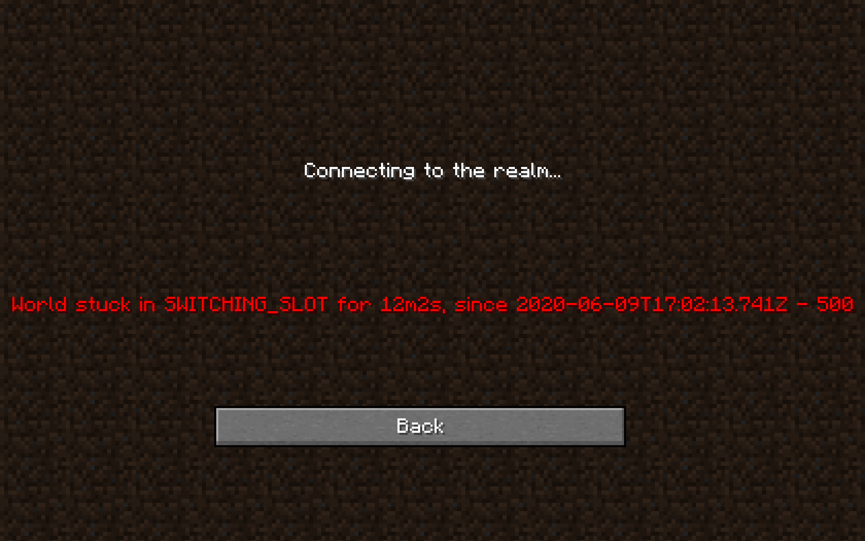 I was having trouble connecting to my realm and after doing some research and troubleshooting by trying to switch worlds and failing I received the error code: "World stuck in SWITCHING_SLOT" and can no longer move past this error code