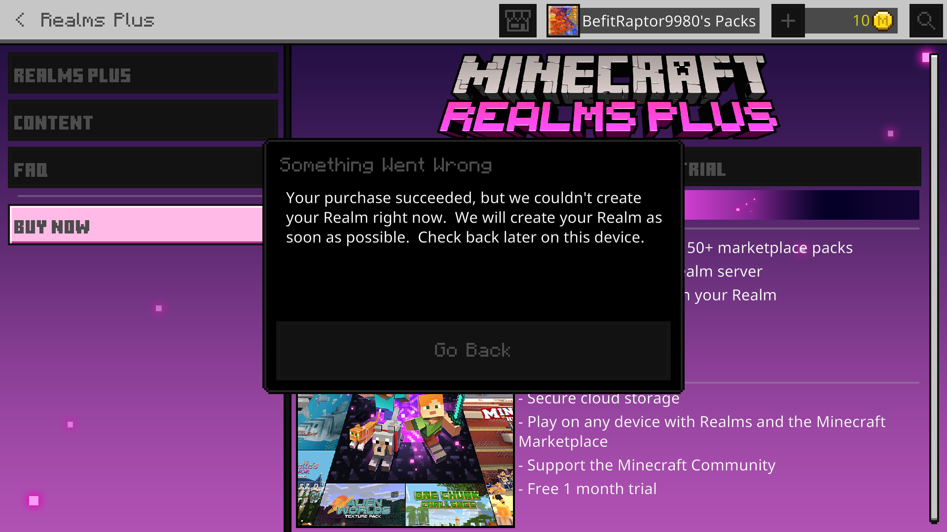 I tried to create a realm (bedrock edition) and it gives me the error message of "Your purchase succeeded, but we couldn't create your realm right now. We will create your realm asap. Check back later on this device. I've looked up the issue and people have had it stuck for weeks and this bug has been marked resolved twice and it still hasn't been resolved. I have also tried email mojang about it and i just got a bot response.