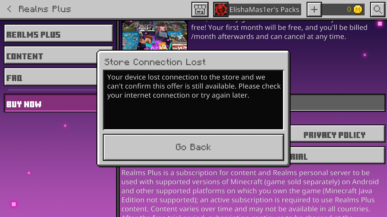 So ive been trying to start a 30 day free trial for realms plus, but whenever i try (ive tried on all devices) it says there is no connectivity to the store. Everything online still works but for some reason it just keeos sjowing up. (As seen on image provided) All i ask is if you can start my 30 day free trial for me. It's still on my account.