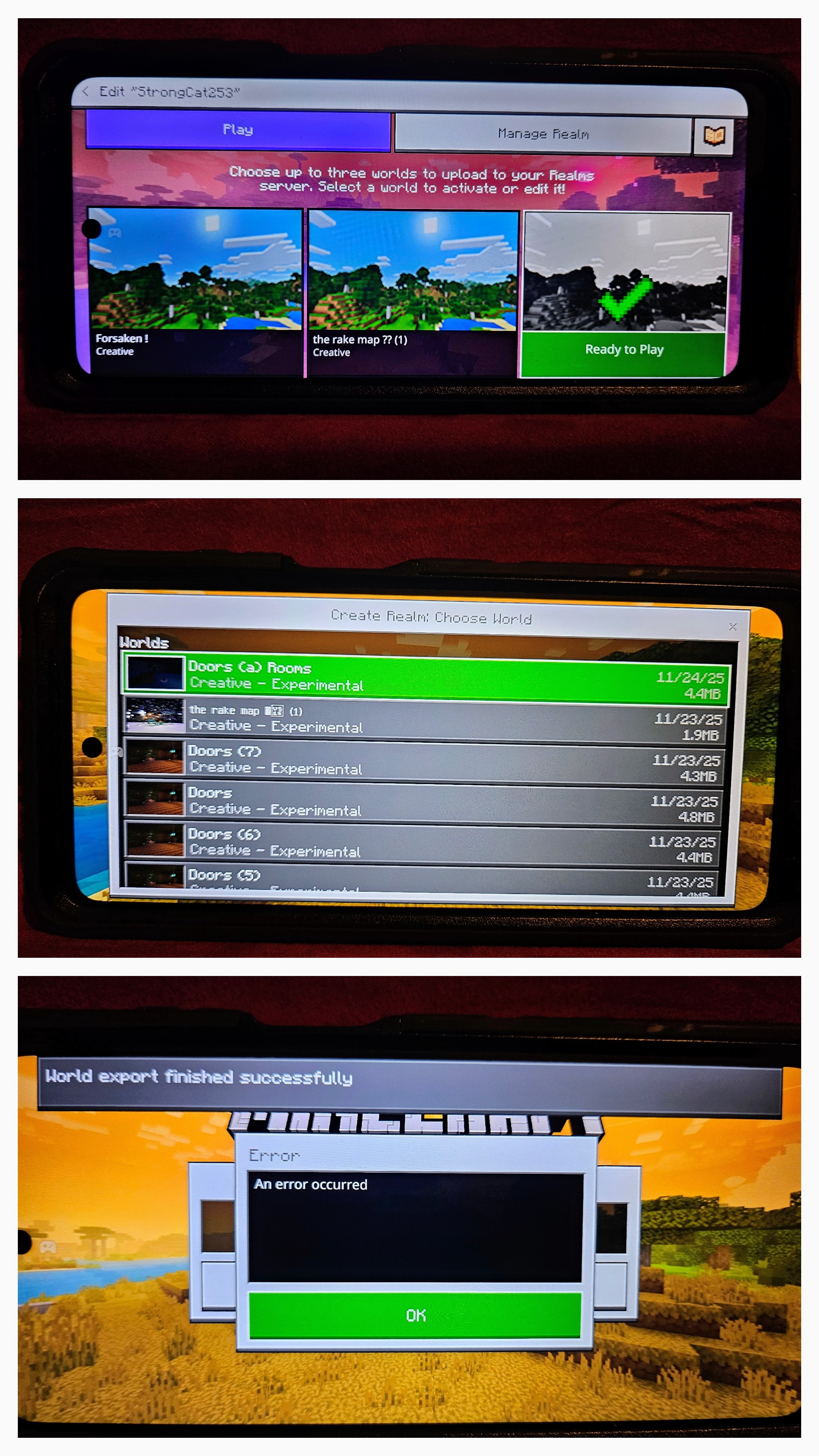 Yes Unable to upload a saved world to a new realm - keeps saying "an error occured" and also "occured" should be spelled "Occurred"