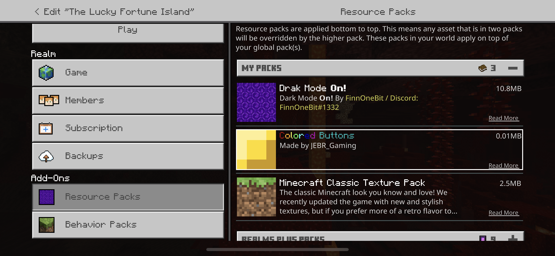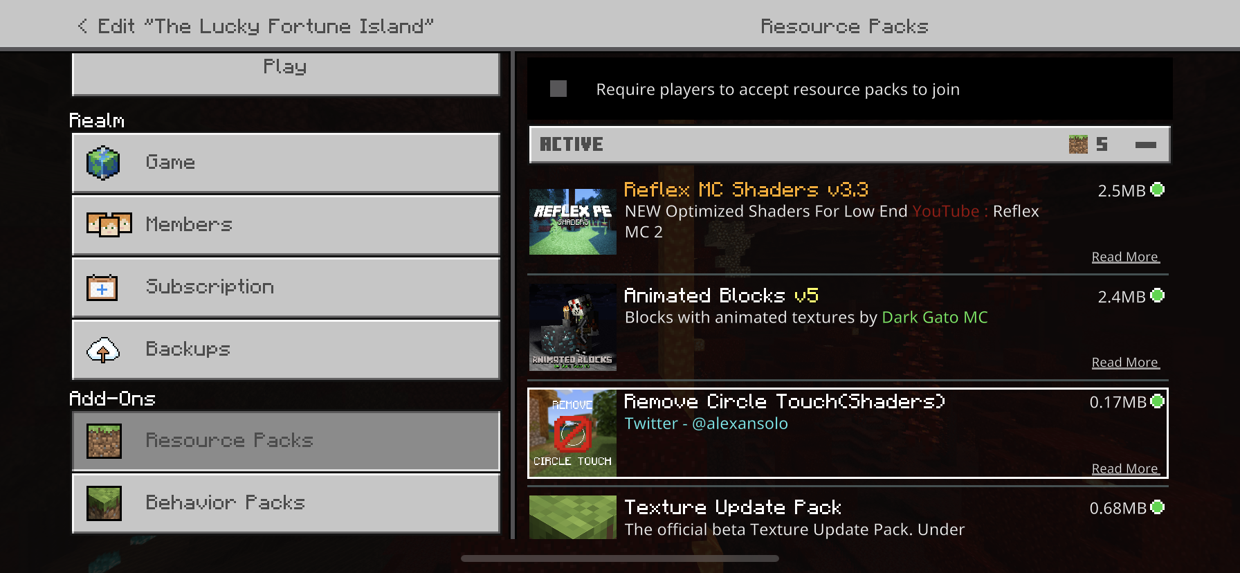 In my realm, I tried to add shaders and animated packs. In loading screen kinda weird to me like spam asking me to join download it. Then, It changed to purple and black checkers. I entered my world, it changed my buttons, health bar, chats, and etc. I never downloaded this pack, "H4 Shaders v14". This pack keep appearing random when I add shaders or mods. I tried to remove this pack, it is impossible to permanently delete forever.