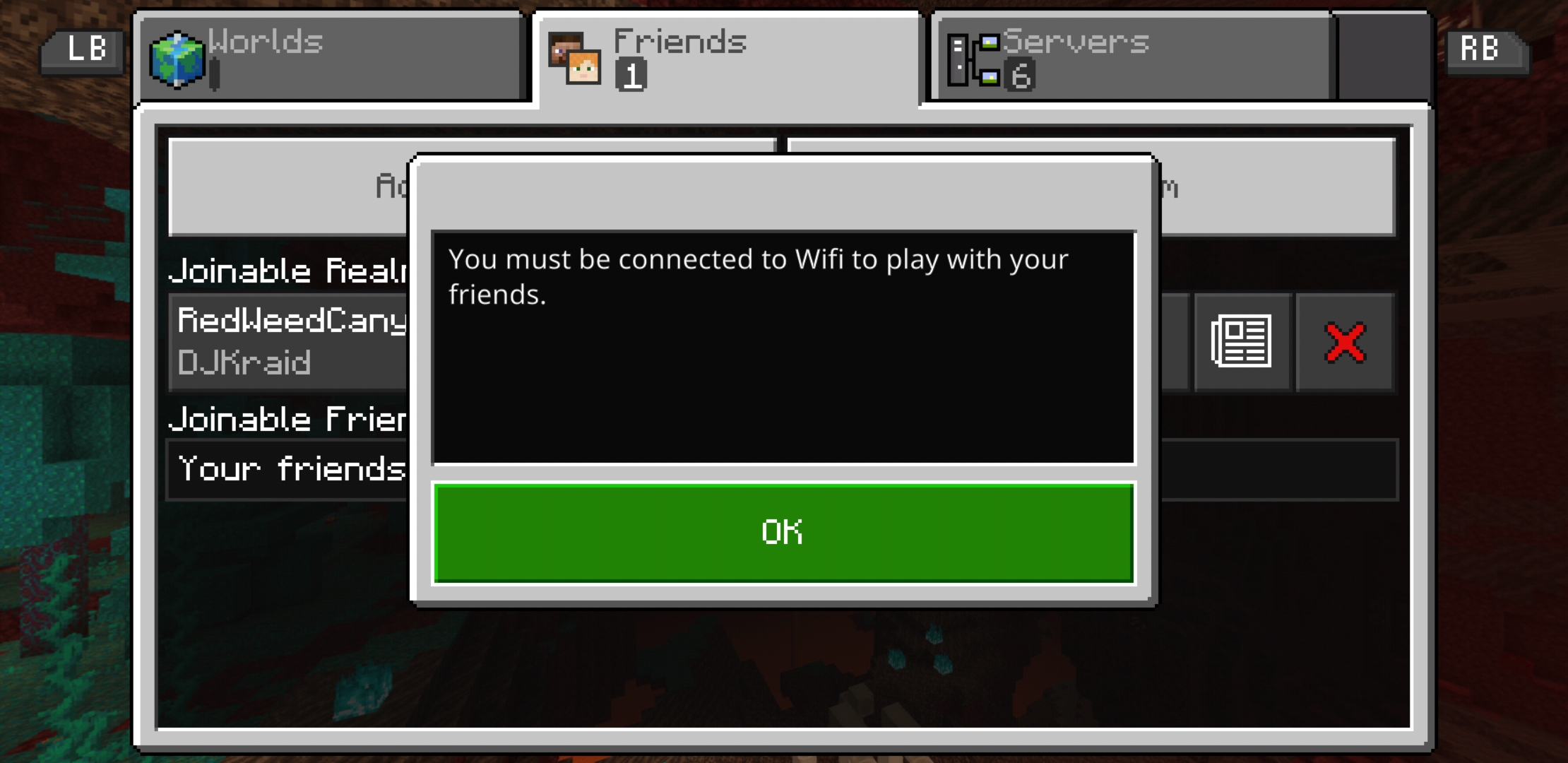 In my setting in the home page of the game i have my cellular data set to on to play on my phone and I still get the "You must be connected to wifi to play with your friends" message 😞 I cant play in any servers or with my friends in the realm please help.