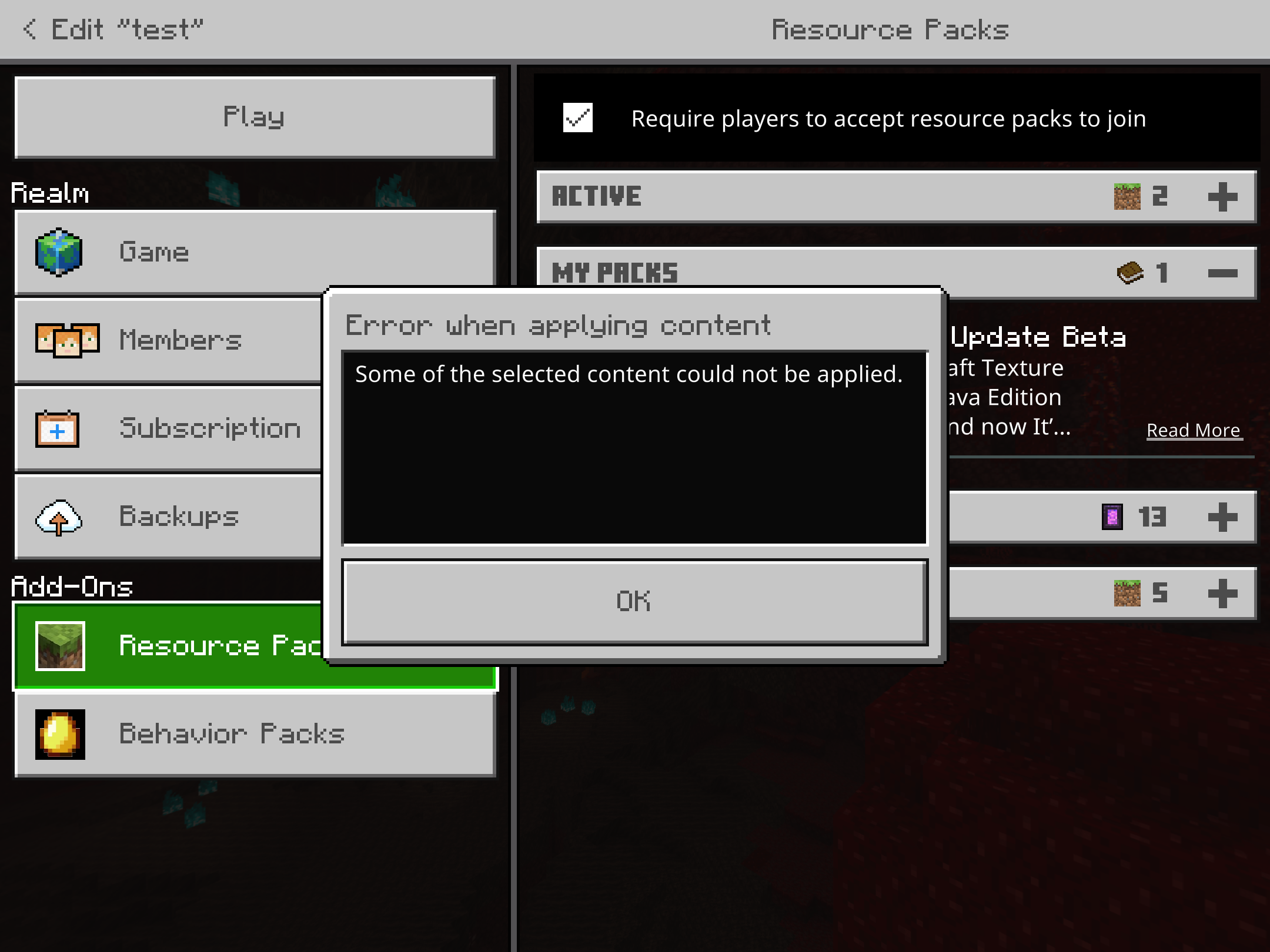 I was trying to download custom add-ons on my switch, and online the suggested process to do that is to upload the add ons to a realm and then download the world to the switch, but it will not let me upload add-ons to the realm