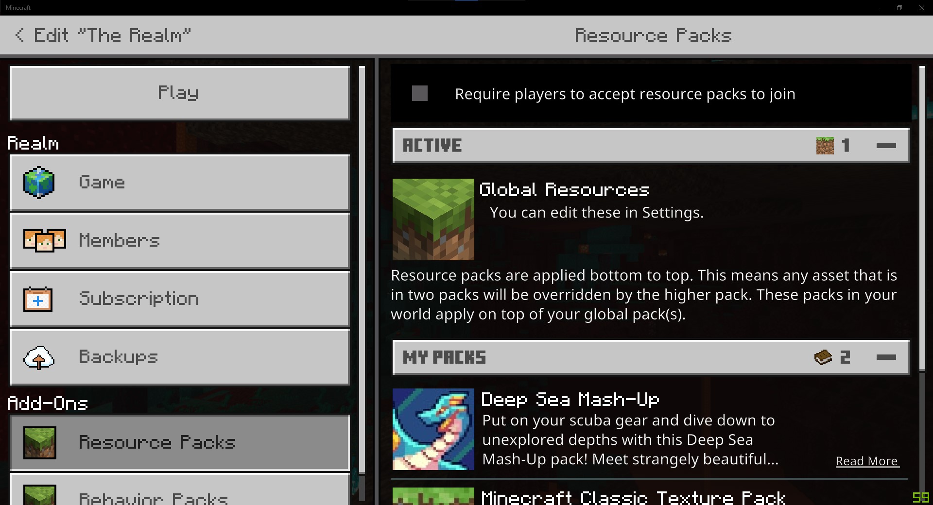 So I was messing around with the resource packs for minecraft realms and noticed you could activate them, however there wasn't a way to deactivate them, as when you went into the realms settings to change it to deactivate, so it wouldn't prompt it on everyone upon joining, it would only show "Global Resources."