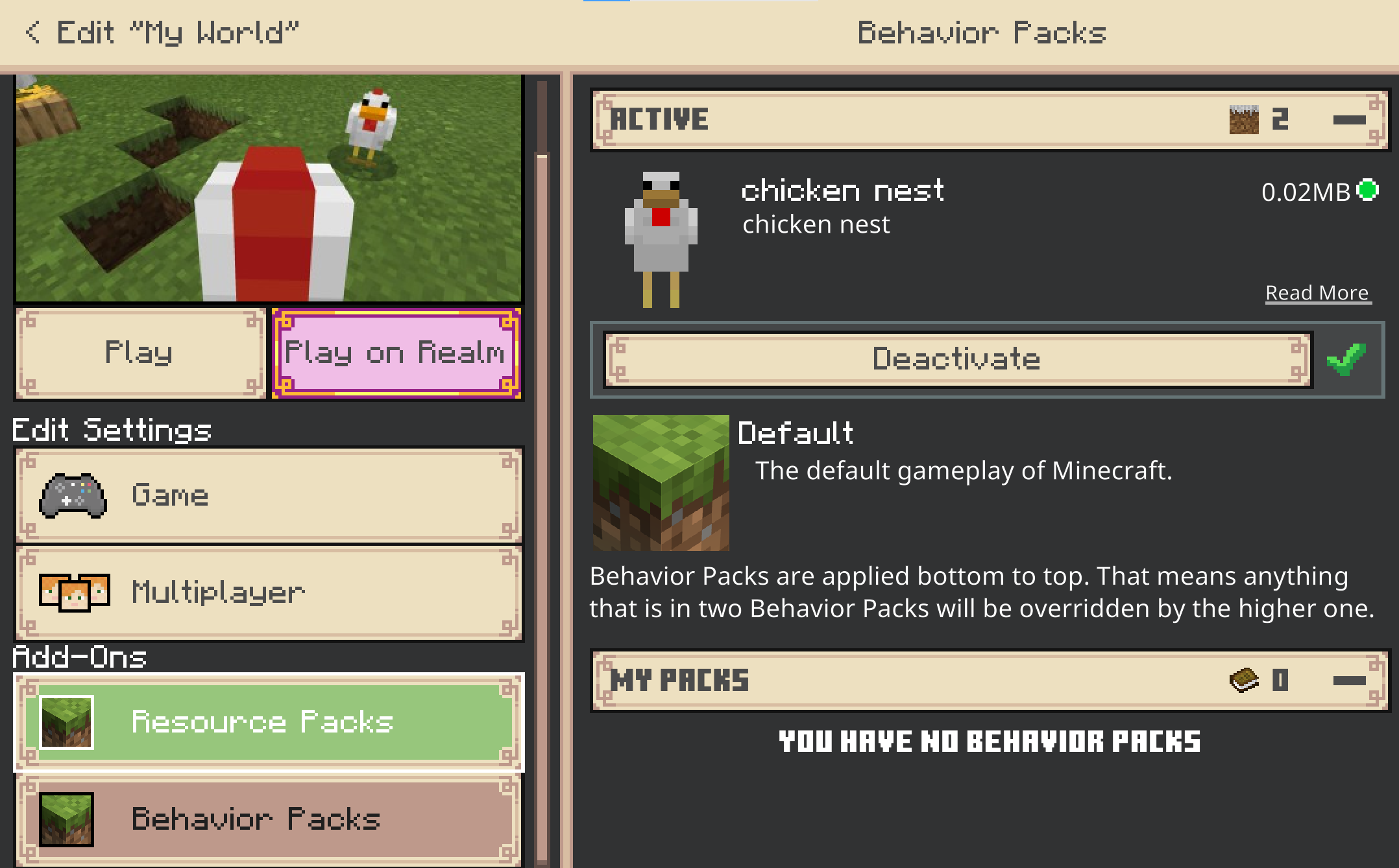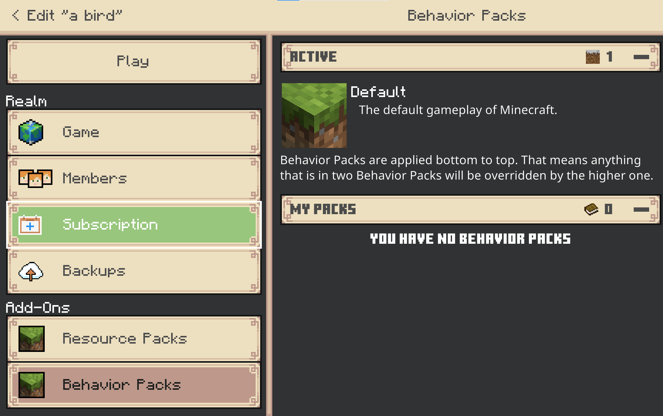 realms menu will not see the behavior pack no matter what i do, i have tried reseting the realm, removed all experimental components and redid the version number and uuids and it still will not show