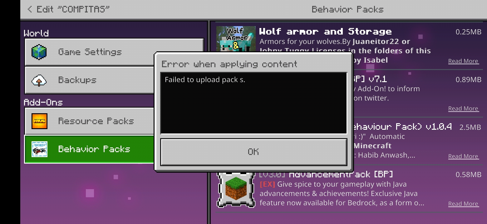 When I try to put an addon in my realm it gives me an error and it won't let me put it, but when I try it in a separate mindo the mod works perfectly so I would like to know if you can solve that problem or tell me what I can do to solve it myself .