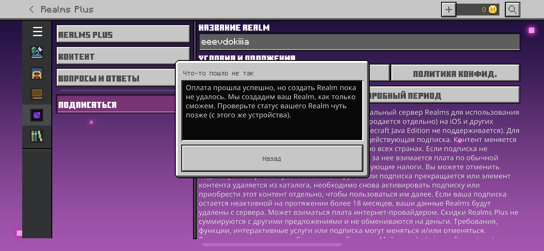 I paid for realm plus a few days ago, but still can't create my server. 'Payment was successful, but Realm has not yet been created. We will create your Realm as soon as we can. Check the status of your Realm a little later '. This banner pops up every time I try to log into Realm. I want to say right away that the solution to this issue with the label βduplicateβ does not suit me. Please take action and soon make it possible to play on the Realm server, or return the money (599β½)