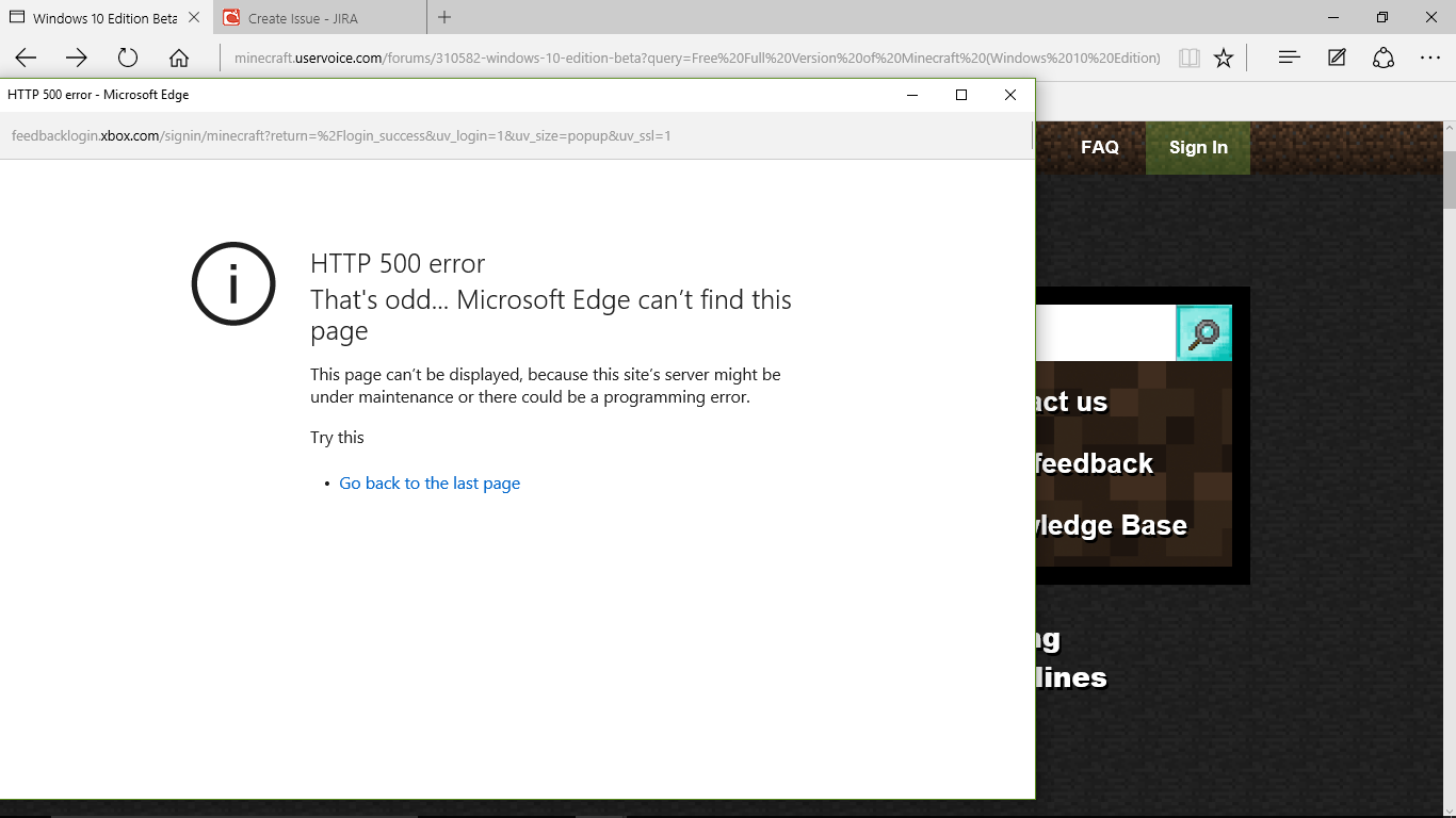 For a while now, I have been trying to post feedback on Minecraft's Uservoice, but I keep on getting an error page (image attached). Why is this happening to me? I also tried submitting feedback through Google Chrome, but that also gave me an error.