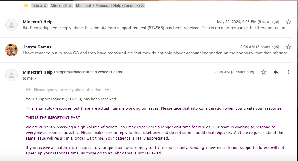 If you are trying to respond to an open ticket that you filed with Minecraft support, please respond to the message from your email inbox rather than writing to this address.