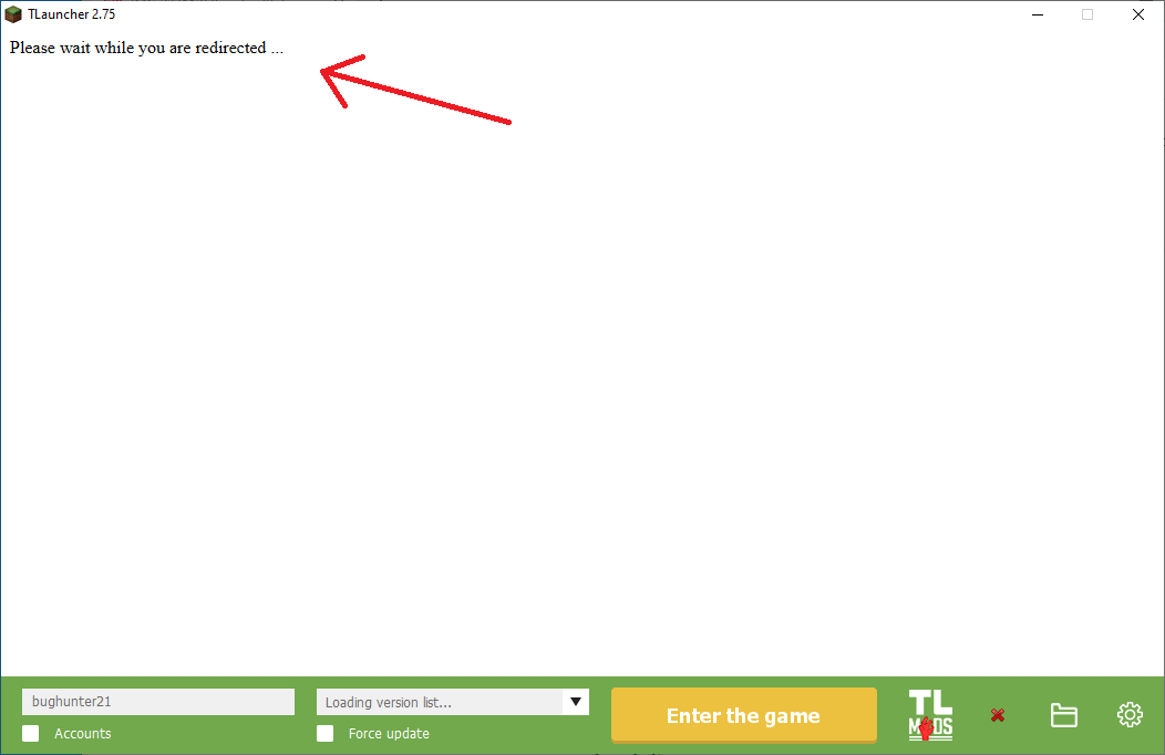 Minecraft Launcher TLauncher with showing text on Please wait while you are redirected .... So, TLauncher tries to open a web browser with link of Random URL.