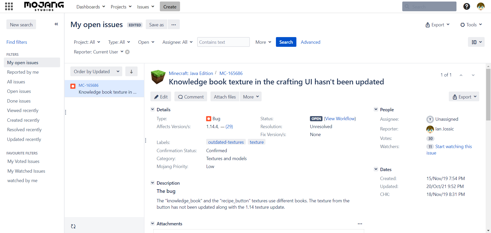 I'm presented with an empty list instead of the one bug I reported that's open (I did double check, that bug is open at the time of writing).