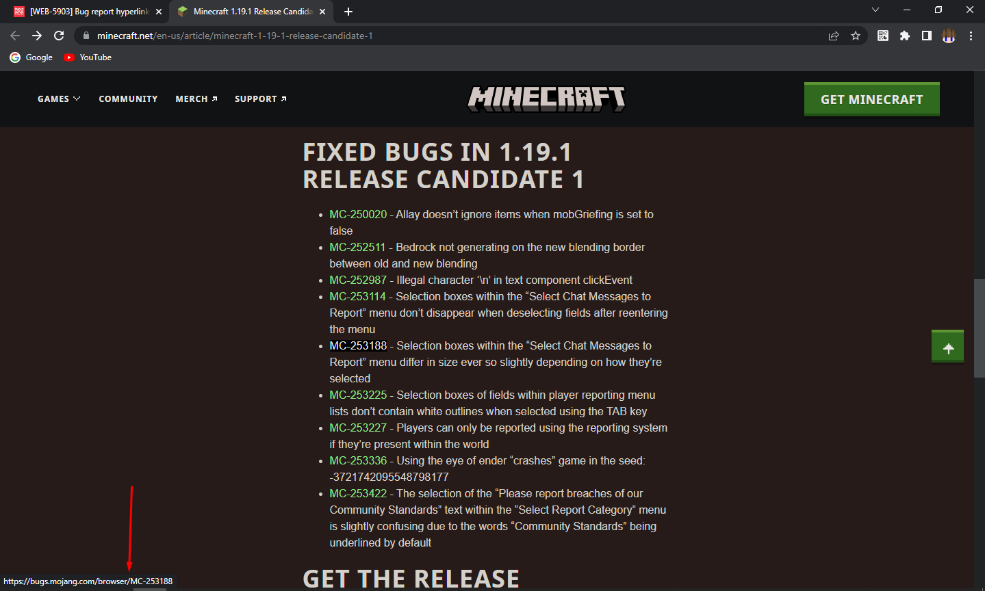 Navigate to the 1.19.1 Release Candidate 1 article on minecraft.net.