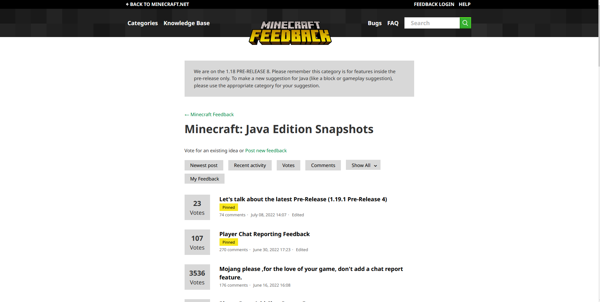 When navigating to the Java Edition snapshot category, the notice on the top of the page currently shows that the snapshot is 1.18 Pre-Release 8.