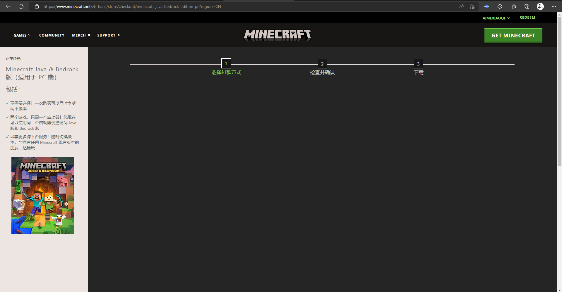this is URL:[Minecraft Java & Bedrock 版(适用于 PC 端) | Minecraft|https://www.minecraft.net/zh-hans/store/checkout/minecraft-java-bedrock-edition-pc?region=CN]