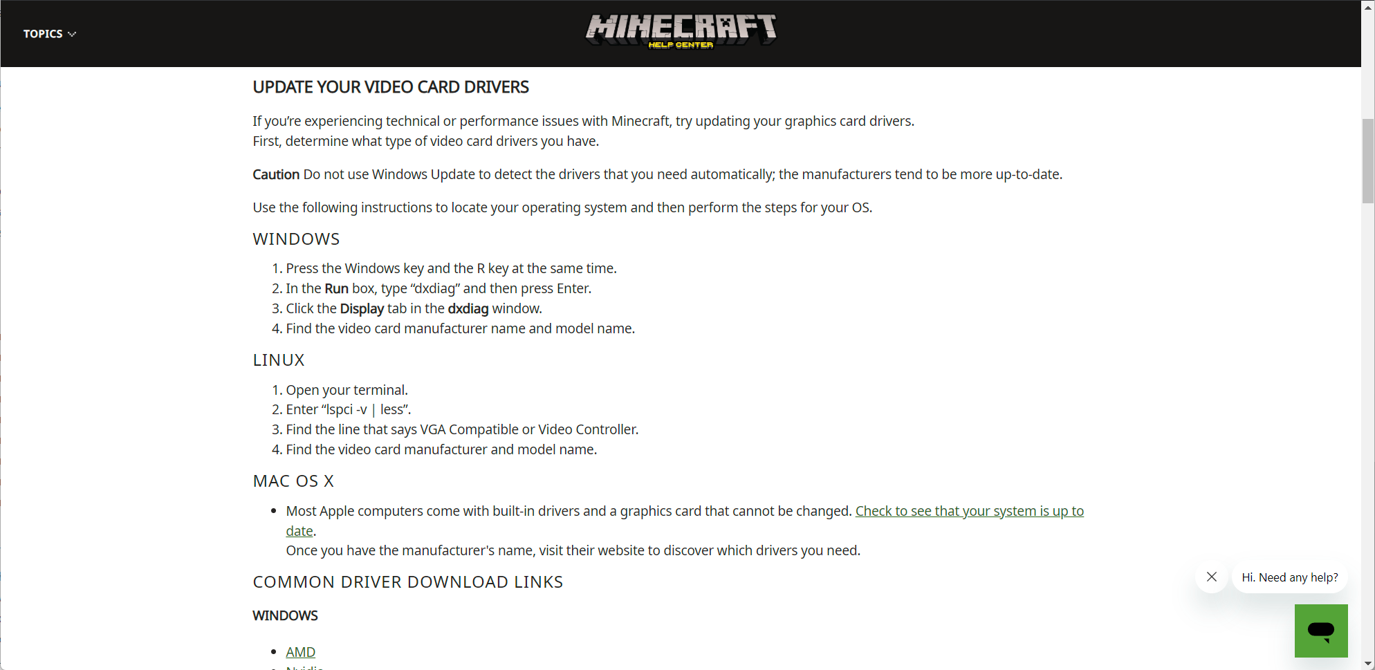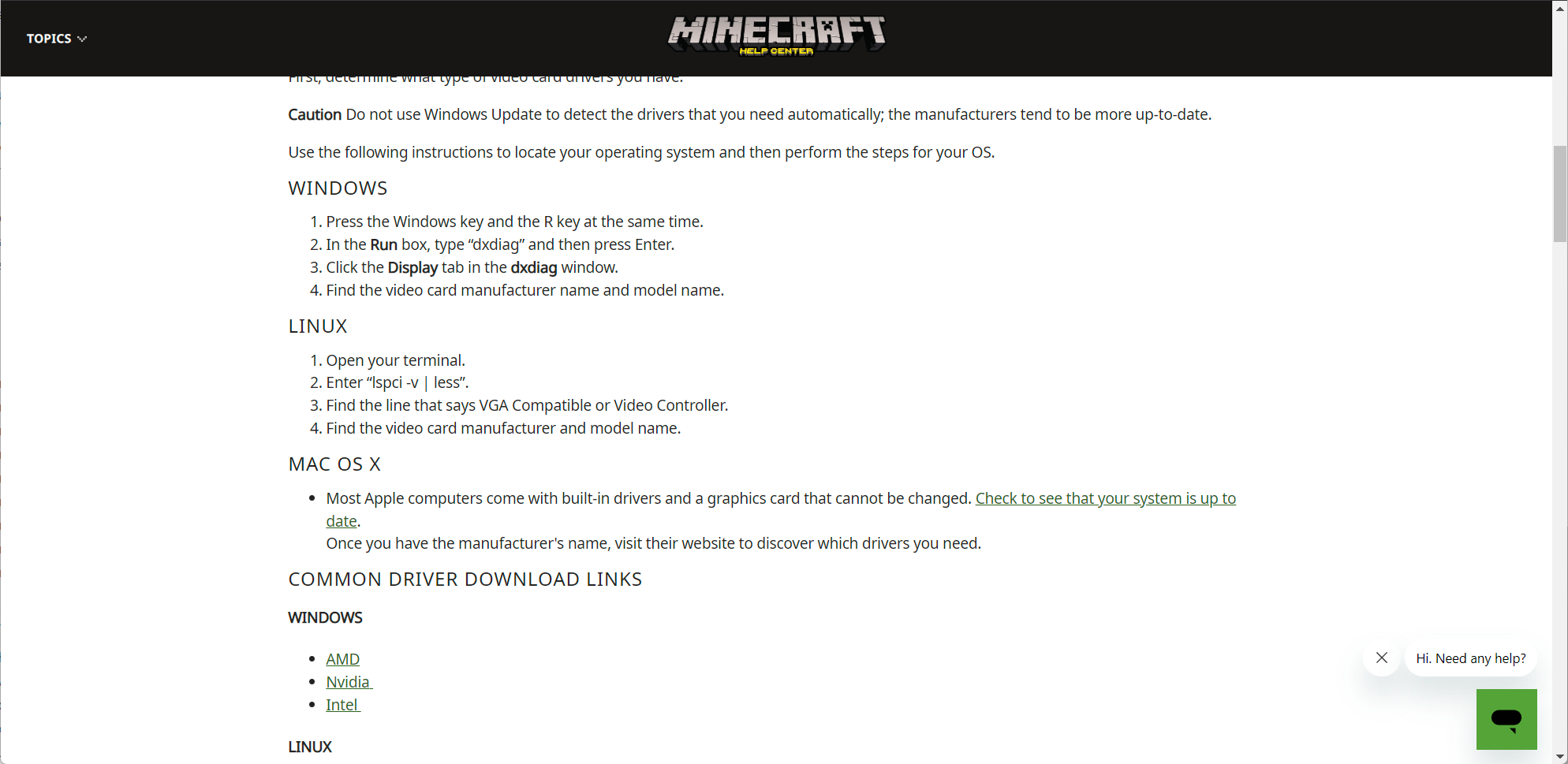 Actual: The Minecraft Help Center banner at the top of the page covers the title and at least the first line of text.