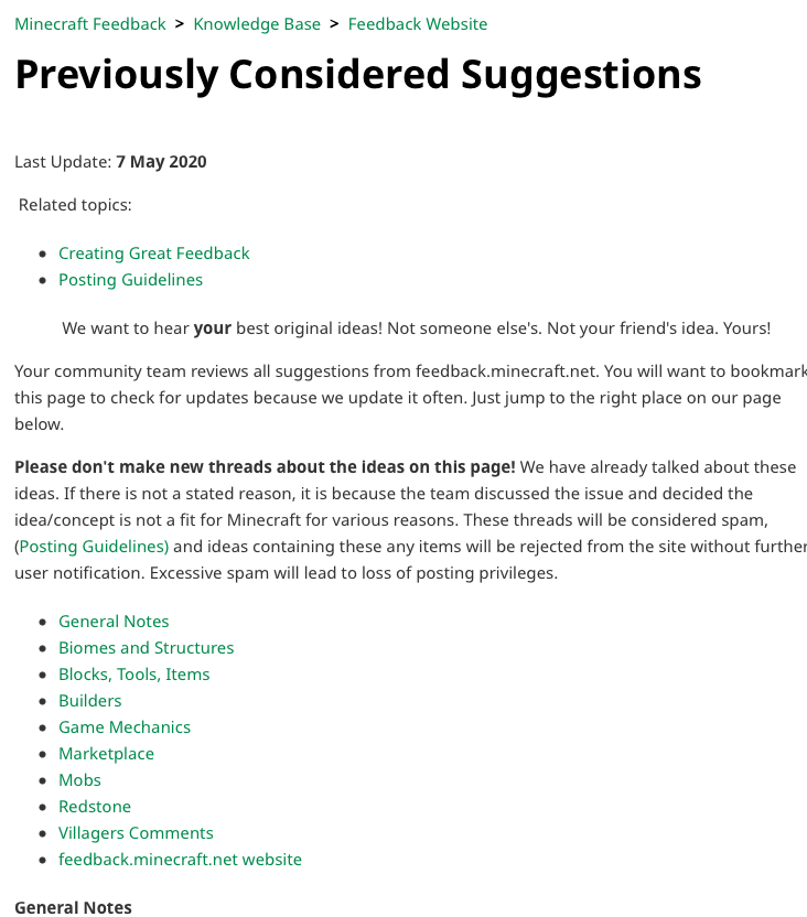The Feedback Site's Previously Considered Posts Hasn't been Updated in Three Years. In Comparison the Minecraft Reddit r/minecraftsuggestions rejected list was updated two months ago.