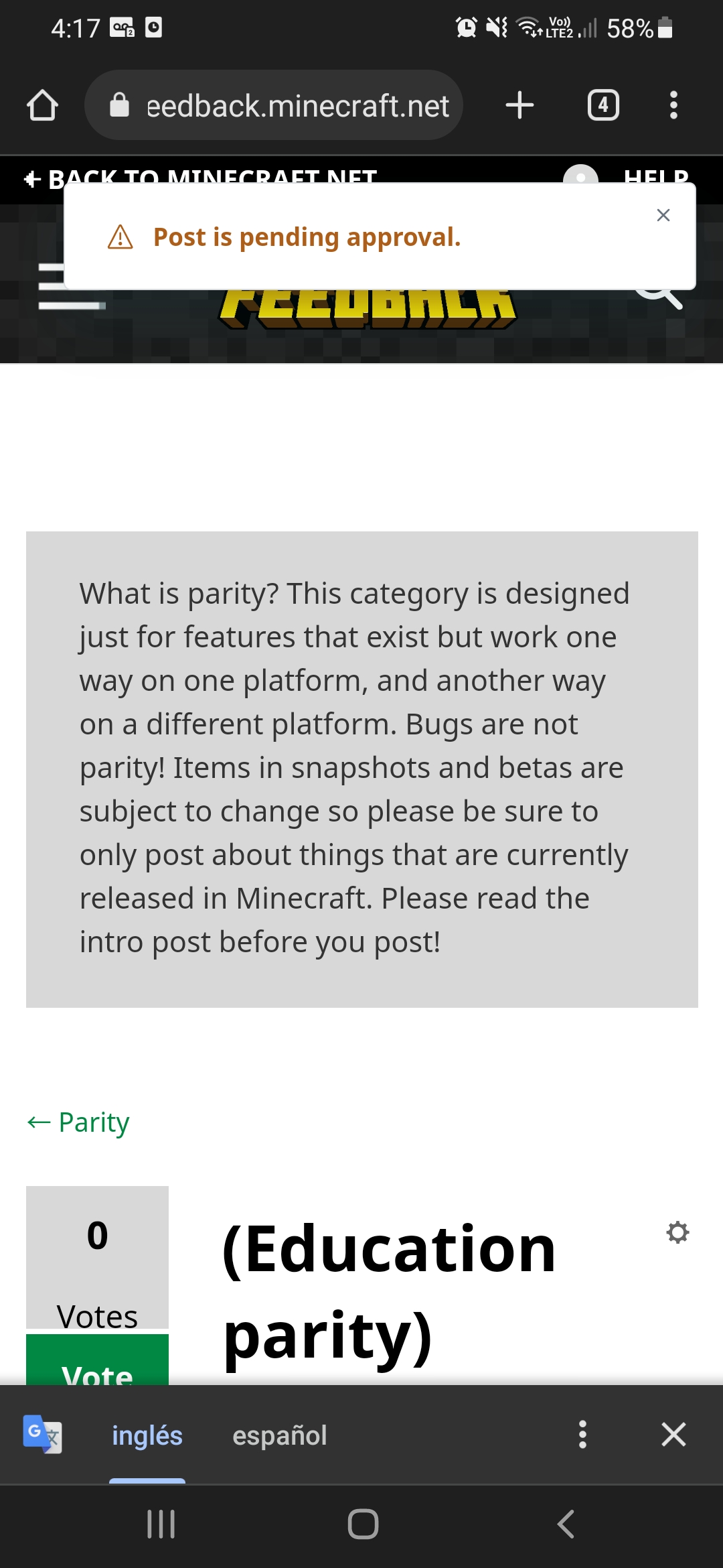 If I write a feedback on the feedback.minecraft.net page, it reaches the probability of leaving the comments as pending for no reason or simply does not say why it leaves them that way