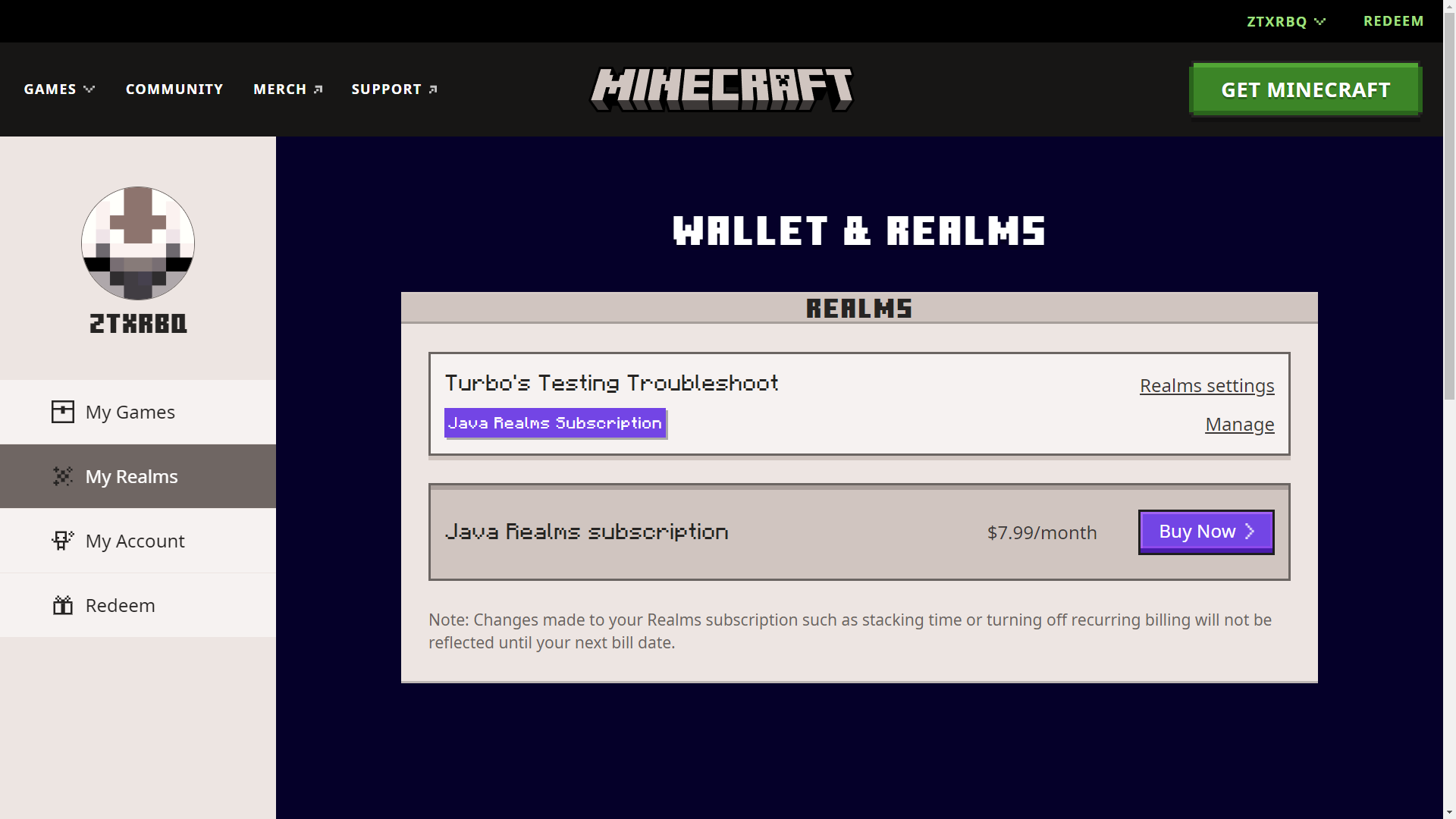 Open Minecraft.net, and navigate to Profile -> My Realms
