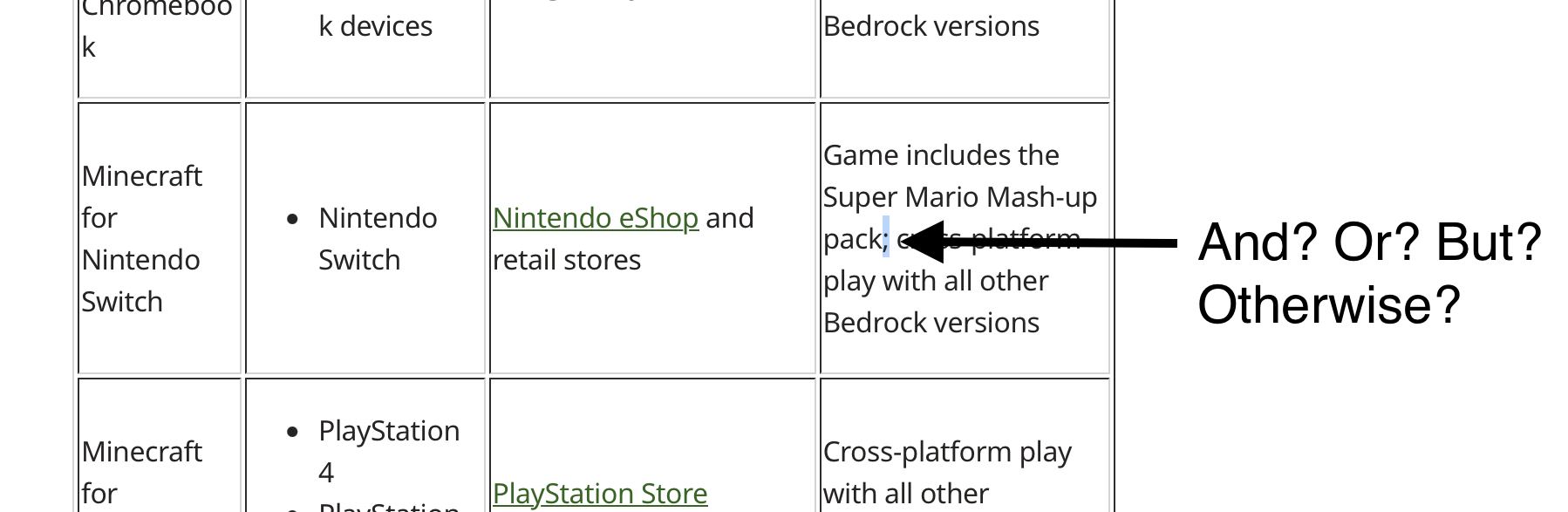 In this article, a semicolon is put in between "Game includes the Super Mario Mash-up pack" and "cross-platform play..." which would mislead people who don't find this deceptive into believing that Super Mario Mash-up Pack could be used on cross-platform multiplayer before finding out currently it isn't after the purchase.