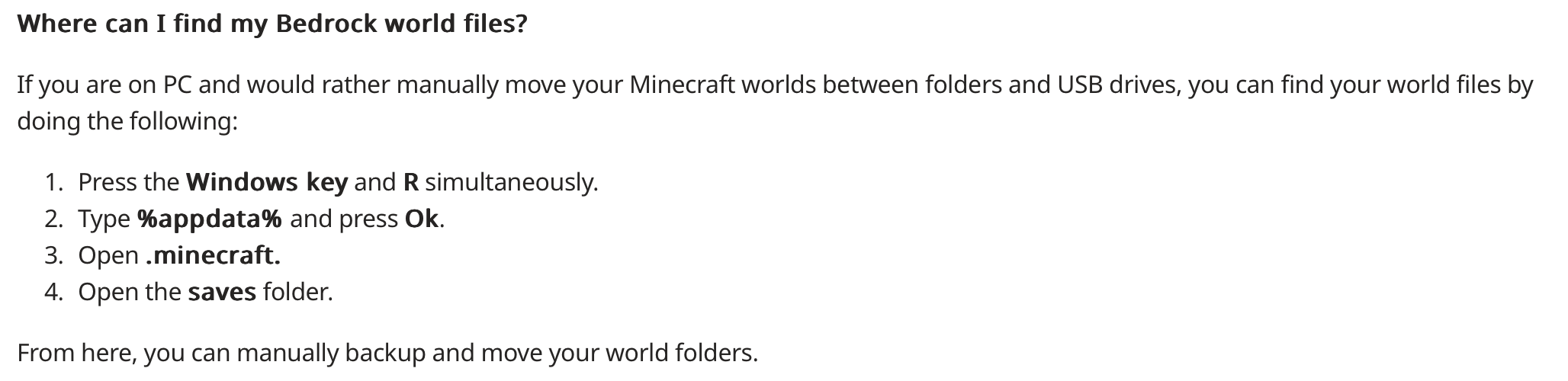 The solution is, if the content transfer / backup is only about worlds, change the phrase from "%appdata%" in step 2 of Where can I find my Bedrock world files to "%localappdata%\Packages\Microsoft.MinecraftUWP_8wekyb3d8bbwe\LocalState\games\com.mojang" and change steps 3-4 so it tells players to access "MinecraftWorlds". Additionally, players of PC can also backup / transfer worlds by using Export world feature in game.