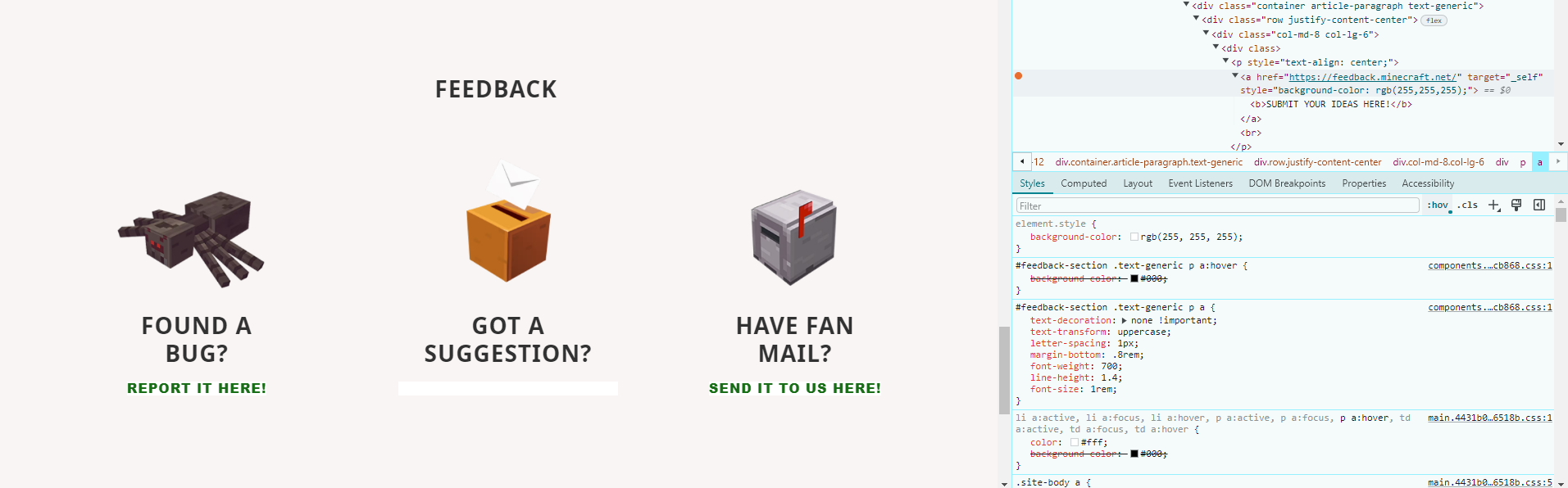 Hovering over the green links of the feedback section on the community page makes them completely white and unreadable: