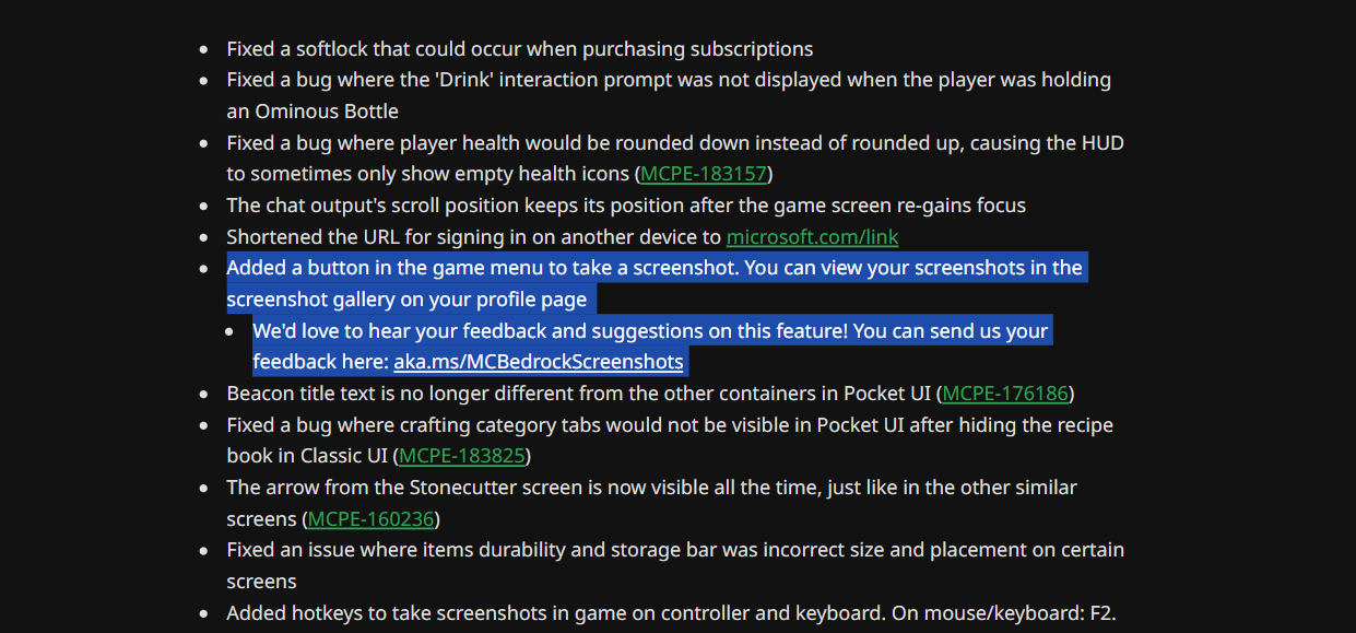 In 1.21.30 Release, The Screenshot button does not exist in 1.21.30 gameplay but the Screenshot features was shown this text in changelog.