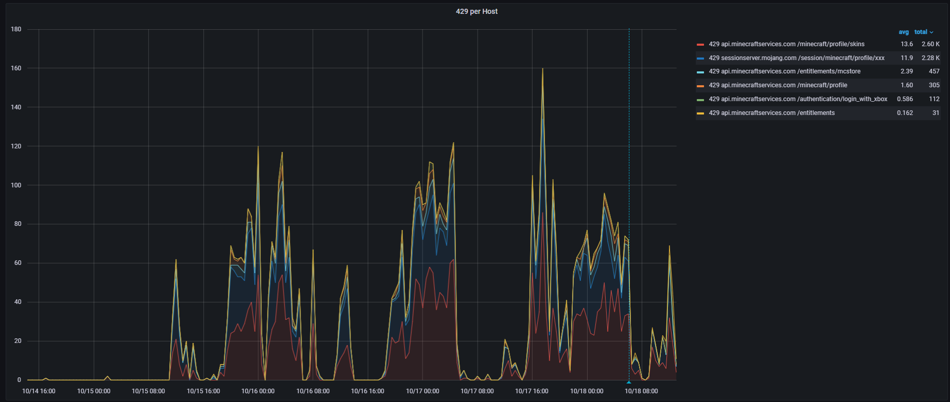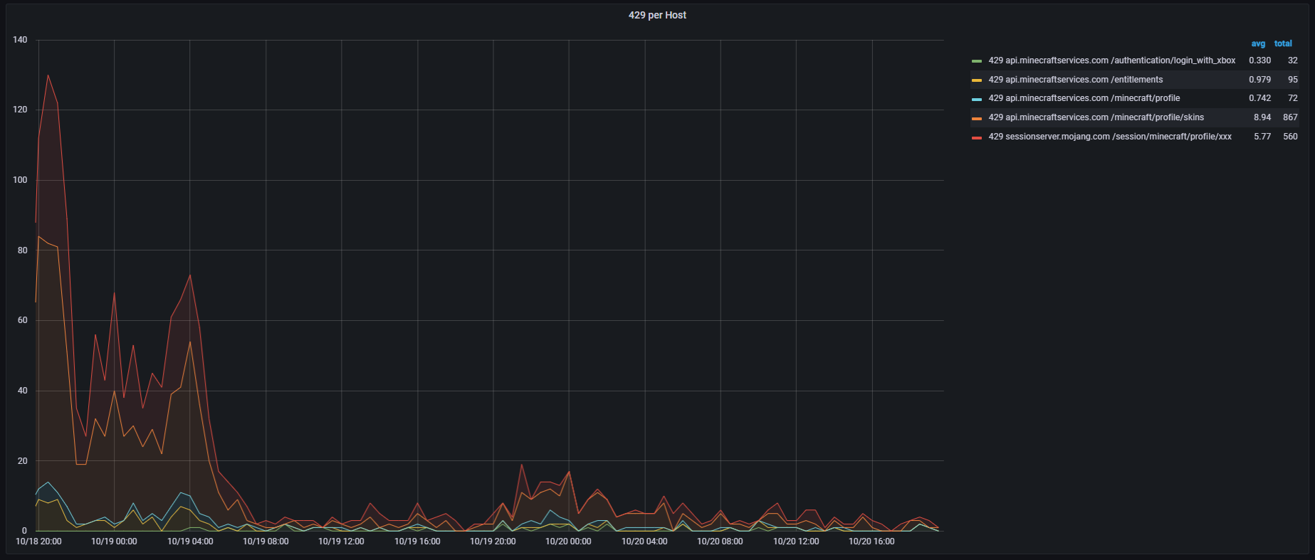 api.minecraftservices.com/authentication/login_with_xboxThis appears to have started on 2024-10-15 around 12:00UTC (see attachment; grouped by 30min).
