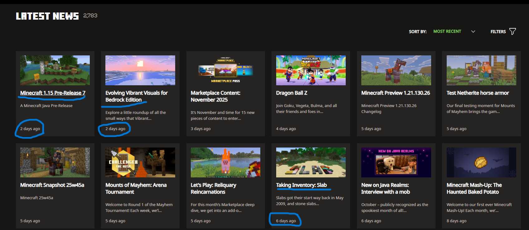 The news sorting on the website doesn’t work. After clicking on ‘See all news’, the Minecraft website takes you to https://www.minecraft.net/en-us/articles where you can sort the news by Most Recent, A-Z, or Z-A. All of these sorting filters don’t work. When clicking on ‘Most Recent’, the news sorter seems to sort things correctly… until you look closer. I have underlined the incorrectly sorted news.